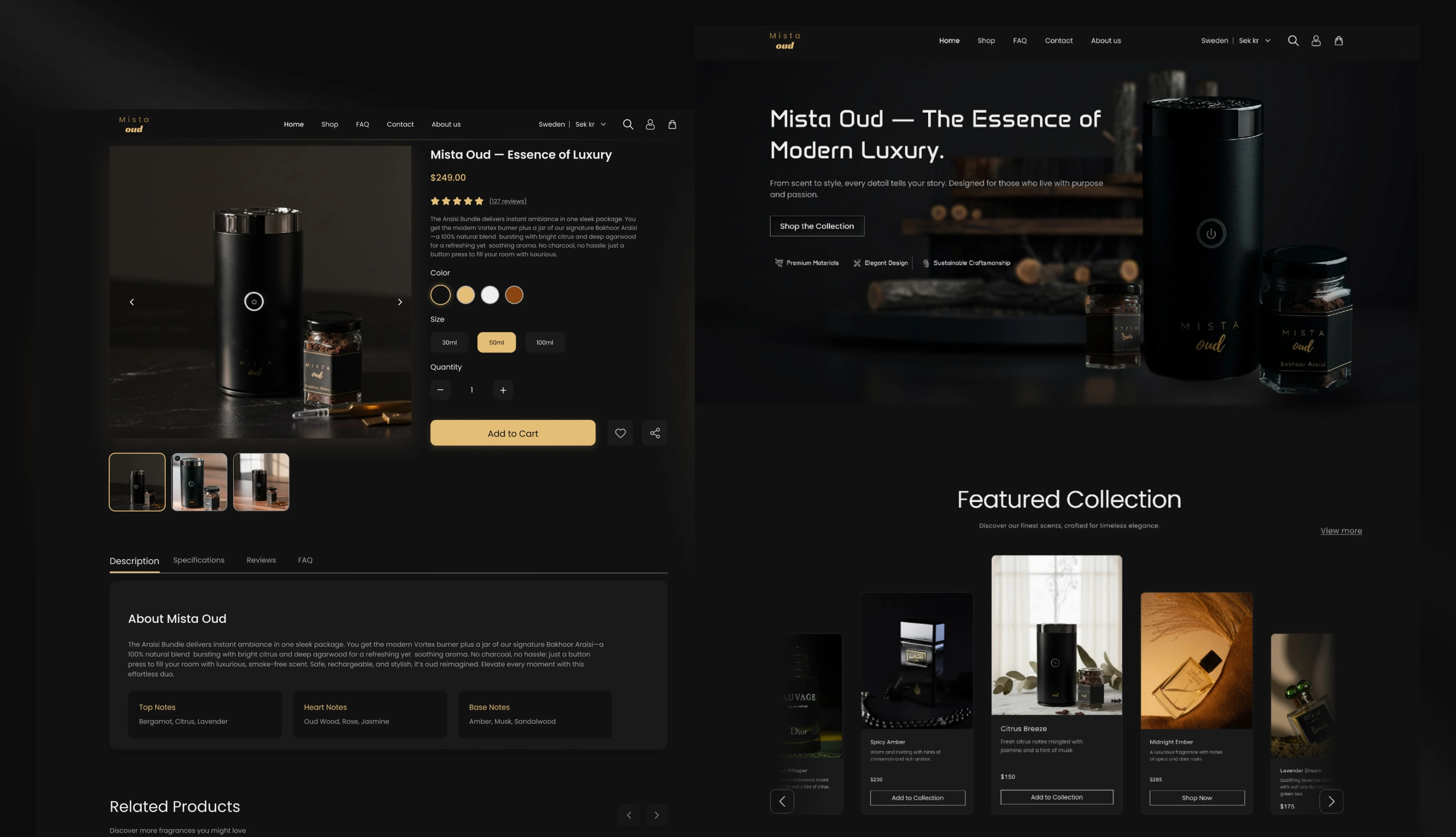 The design follows UX laws, uses a dark premium theme with gold and green accents, and highlights categories, featured...