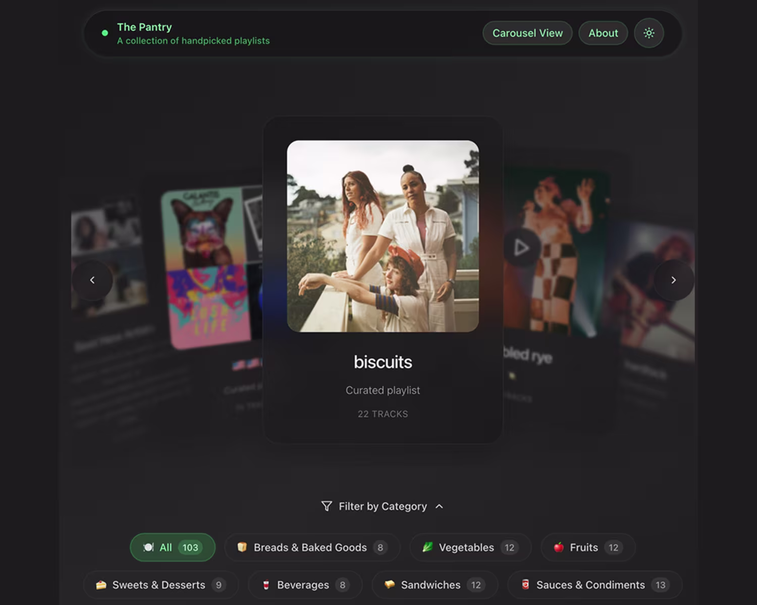 As a part of Lovable's AI Building hackathon I built this interactive Spotify playlist website for a friends playlist series. This site uses Spotify's API via Supabase to pull data and filters and sorts the playlists based on their food type.