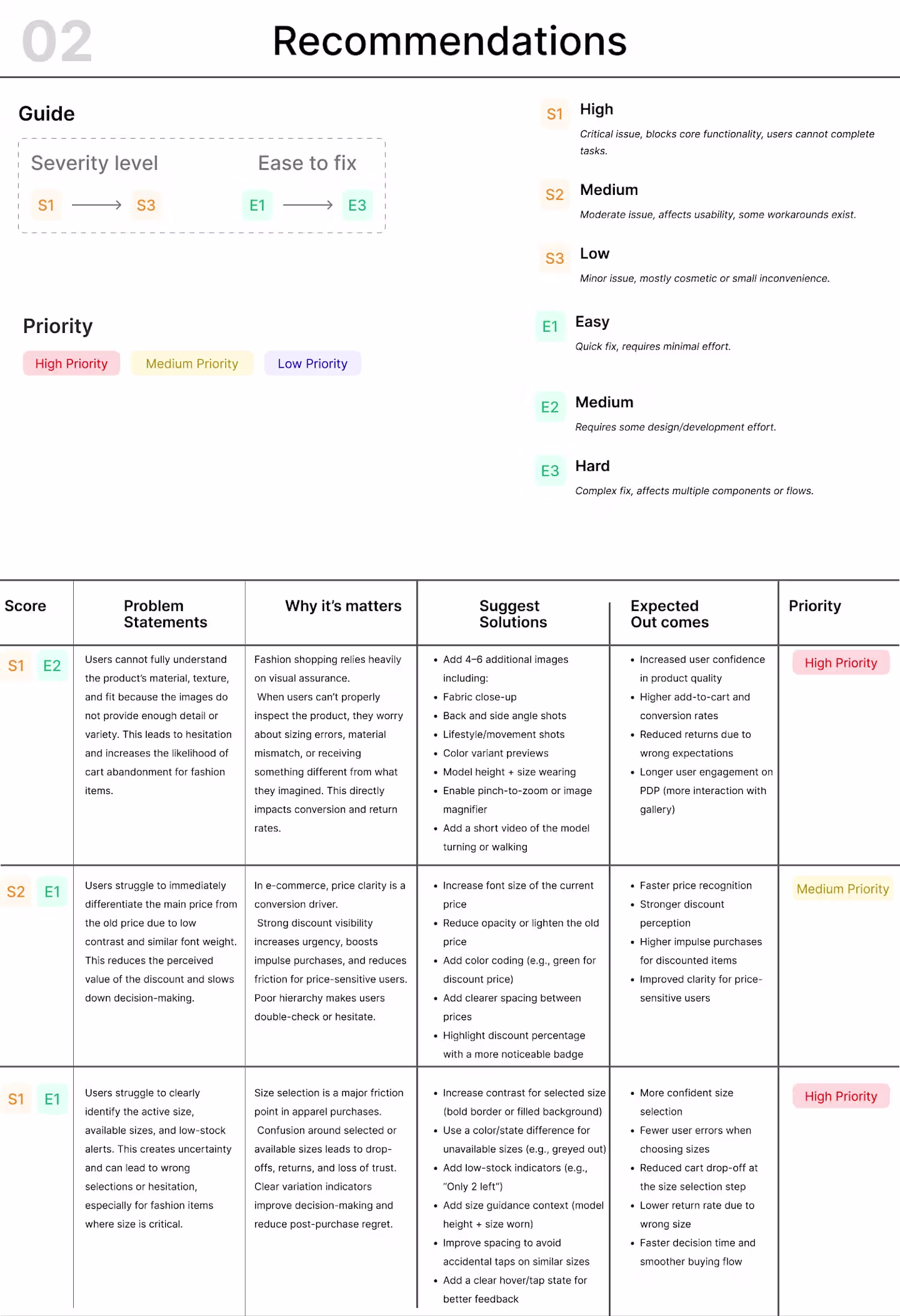 Limited visual depth reduces buying confidence. Users need multiple angles, fabric close ups, lifestyle shots, and zoom capability.