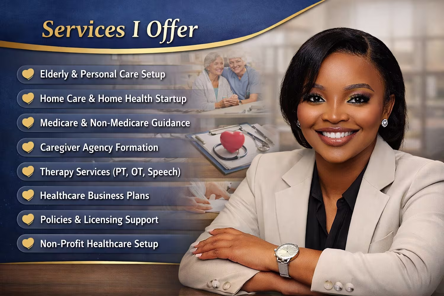 I support entrepreneurs, agencies, and nonprofits to successfully launch and grow compliant elderly and personal care services. Whether you are starting Medicare or non-Medicare services, I provide step-by-step guidance to help you get licensed and operational fast.