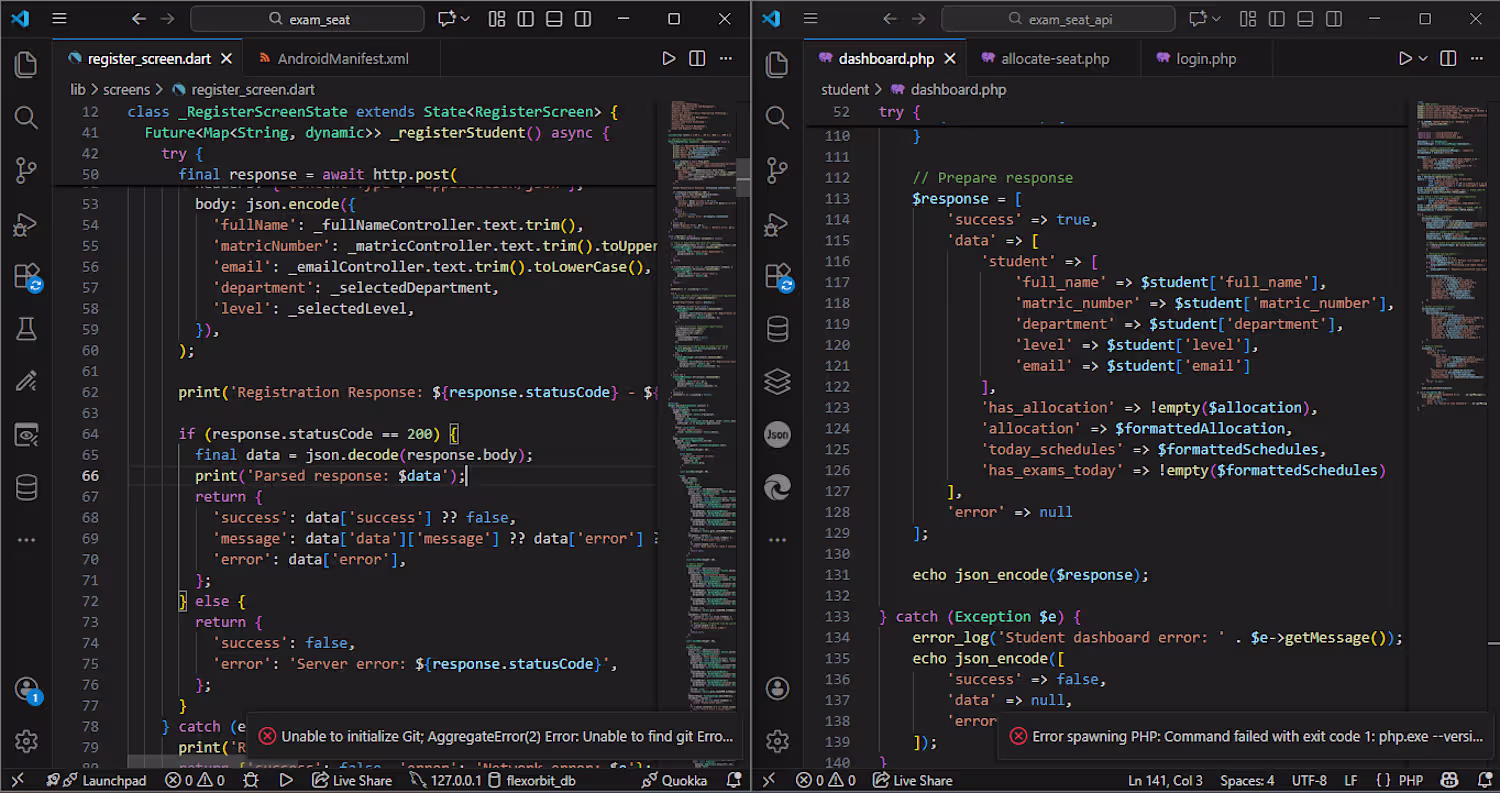 I am currently developing a cross-platform solution to automate and streamline the exam seating process at Federal Polytechnic Ayede. The system features a Flutter-based mobile app that allows students to instantly check their allocated hall and seat number, paired with a robust web dashboard for administrators to manage department capacities and student records. The solution eliminates manual errors through automated allocation logic and secure user authentication.