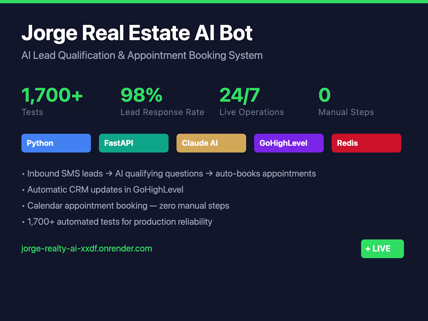 Built a production AI lead qualification bot for a real estate agency. Python/FastAPI backend, Claude API, GoHighLevel CRM integration, Redis, 1,700+ automated tests. Handles inbound SMS leads, asks qualifying questions, books appointments automatically. Live at jorge-realty-ai-xxdf.onrender.com
