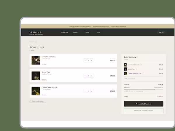 Verdant is a concept checkout flow for a premium plant brand, designed to reduce cart abandonment with a clear, linear journey from cart to confirmation.
