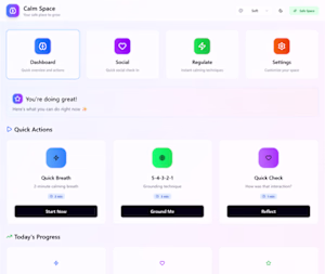 @Galaxia Wu website for autisitic individuals to help them understand social interactions, additionally provide self regulating techniques for autistic people based on some questions asked and based on the anwsers custom a solution