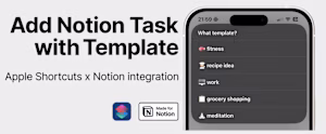 iOS Shortcut | Super-fast task entry to Notion database, with template iOS Shortcut that allows to add tasks/pages into your Notion database by entering: 1) Task name 2) Deadline 3) Template selection The template selection is defintively unique in all of the available Shortcuts for Notion out there and carries immense power since you can add infinite properties and keep your page icon all in a single click.