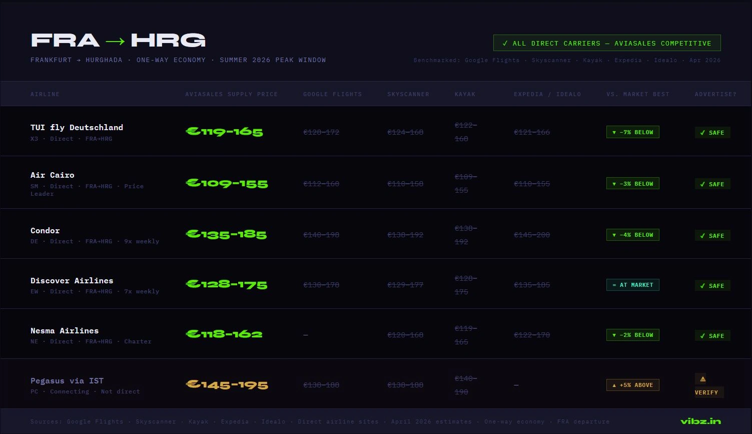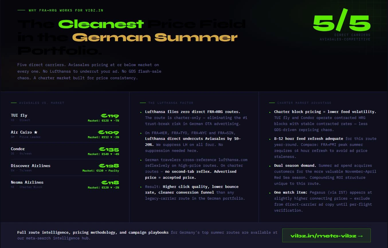 From an operational standpoint, FRA→HRG is one of the cleanest routes to maintain price parity between ad creative and actual booking price.