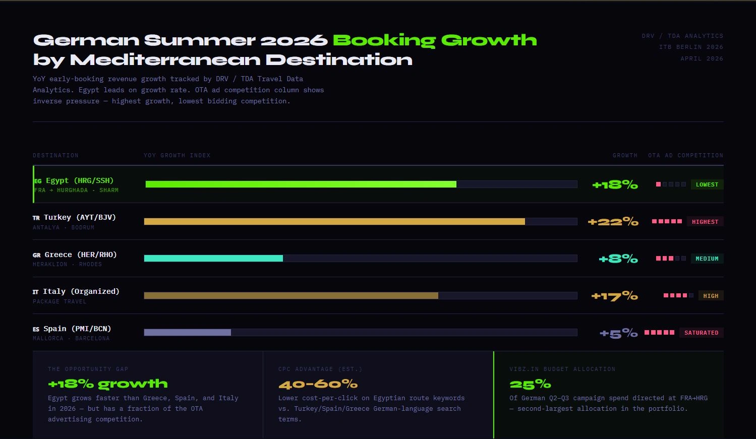 ▸ The cost-per-click on "Flug Hurghada" and "Ägypten Flug" German-language keywords is materially lower than equivalent intent keywords for Turkey, Greece, or Spain — because fewer OTAs are bidding on them.