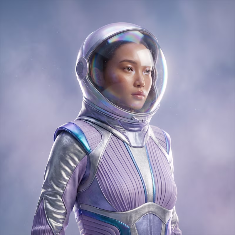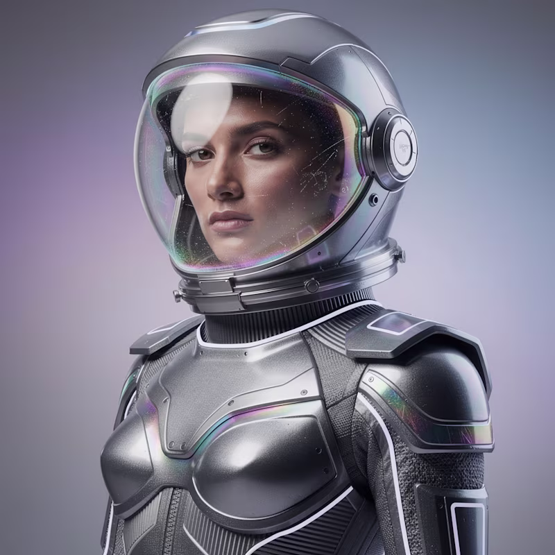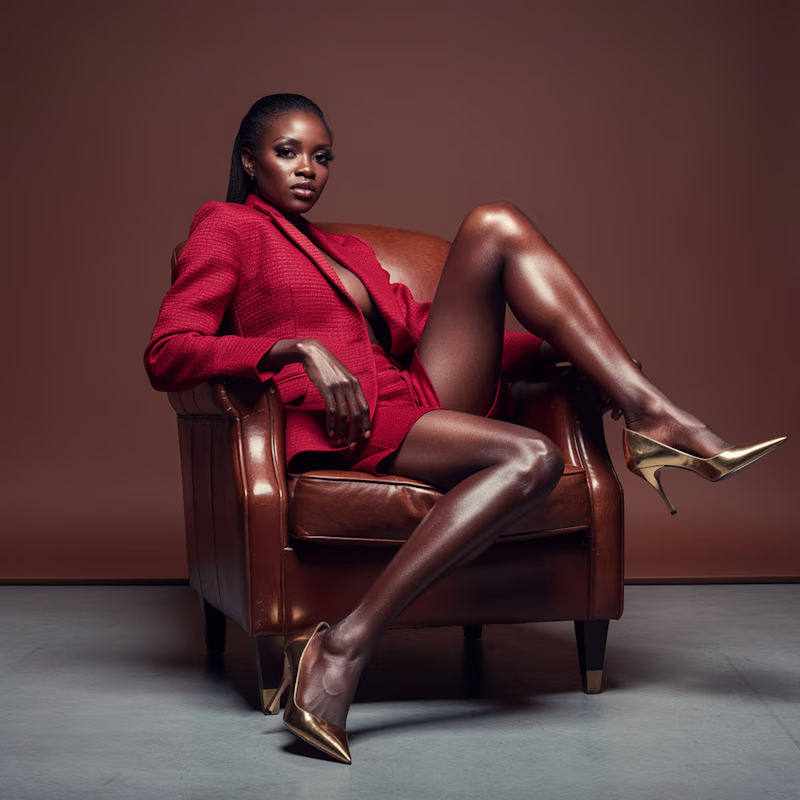 Prompt: "A fashion editorial photo of a high-fashion Black female model in a bold red textured blazer and shorts, lounging with one leg raised on a brown leather chair. Golden pointed heels. Background is a smooth chocolate-brown wall, urban floor. Soft spotlight highlights...