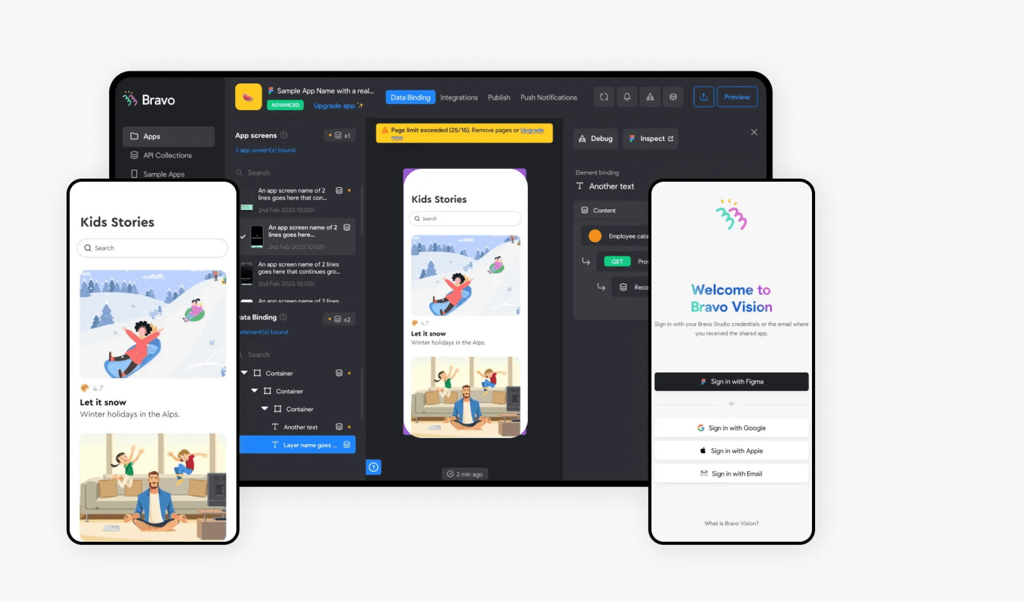 Bravo studio is a design first, no code tool, which allows you to turn your app designs and prototypes into real publishable mobile apps (both iOS and Android).