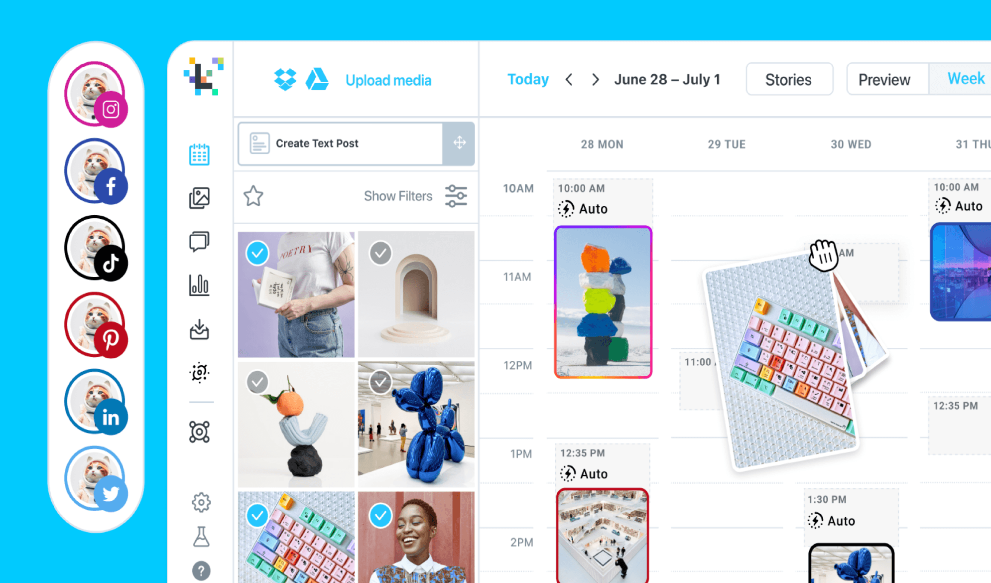Later is a calendar-focused social media scheduling platform with a drag-and-drop interface. Their planning and scheduling tools make it easy to visualize your social media management. Features include photo editing, publishing for stories, and more.