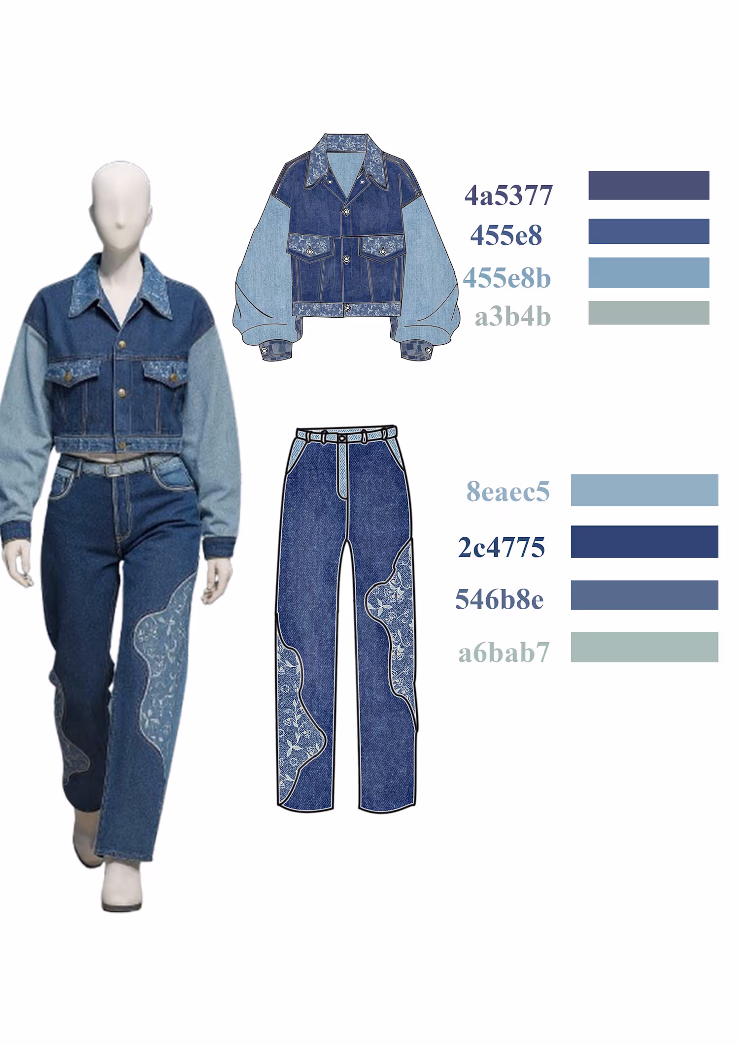 This design is a sophisticated take on contemporary streetwear, showcasing a high-waisted denim ensemble that balances structured silhouettes with intricate textile details. The look consists of a cropped trucker jacket and matching straight-leg trousers, utilizing a tonal blue palette and organic, curvy design lines.