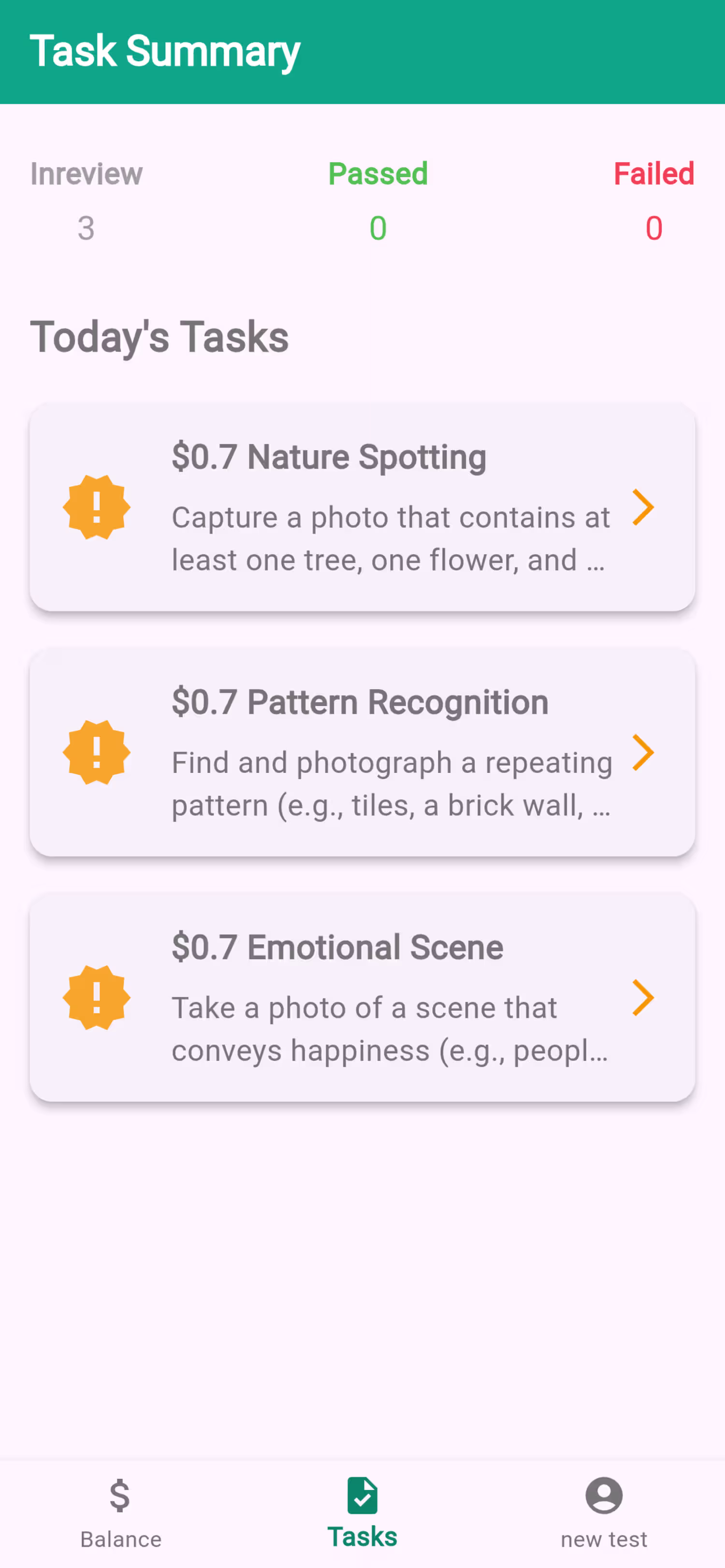 Complete tasks by submitting images. Prizes, failed, pending, a…