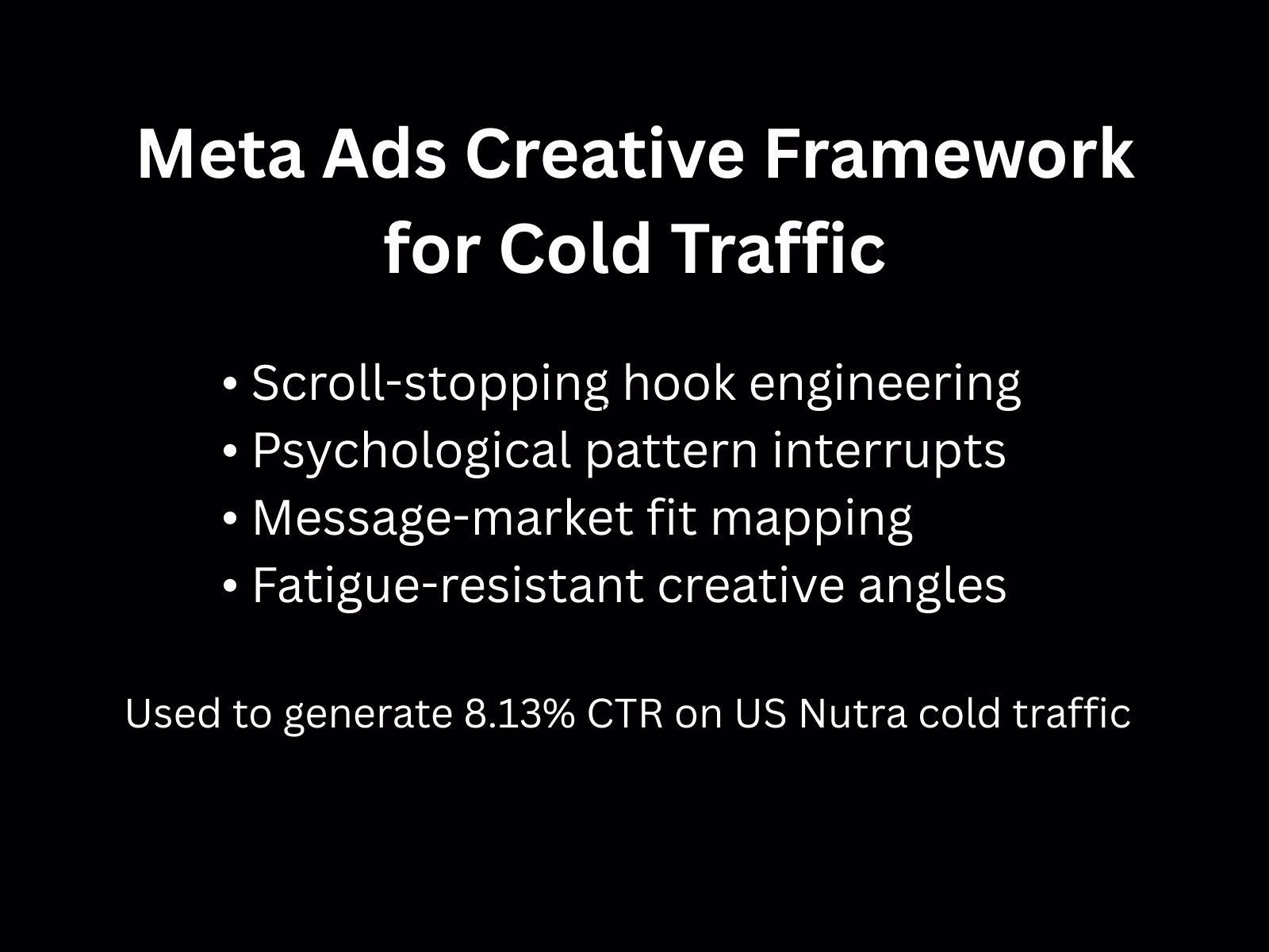 Designed a repeatable Meta Ads creative framework for cold traffic. This system focuses on scroll-stopping hook engineering, psychological pattern interrupts, and message–market fit — built to scale without creative fatigue. This framework was used to achieve an 8.13% CTR on a US Nutra cold traffic campaign.