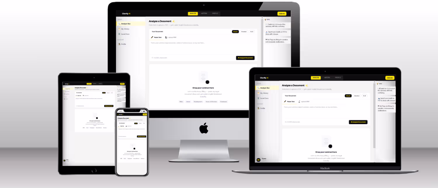 Paste any contract or upload a PDF — get back a plain-English summary, red flags flagged by severity, and a section-by-section breakdown. Three reading levels including ELI5 for non-technical users.
