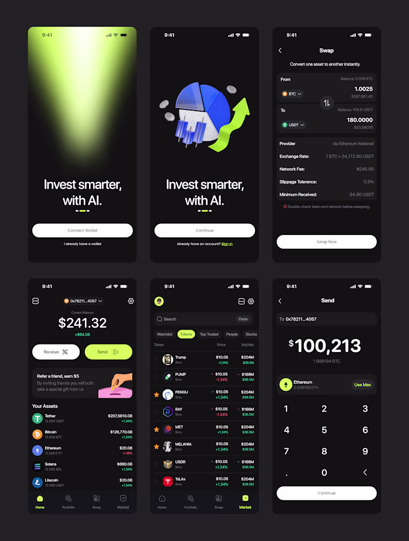 working on a crypto exchange app design with two brand colors, Dark mode is default but the light mode seems so cool as well. which do you prefer? founder is confused as well