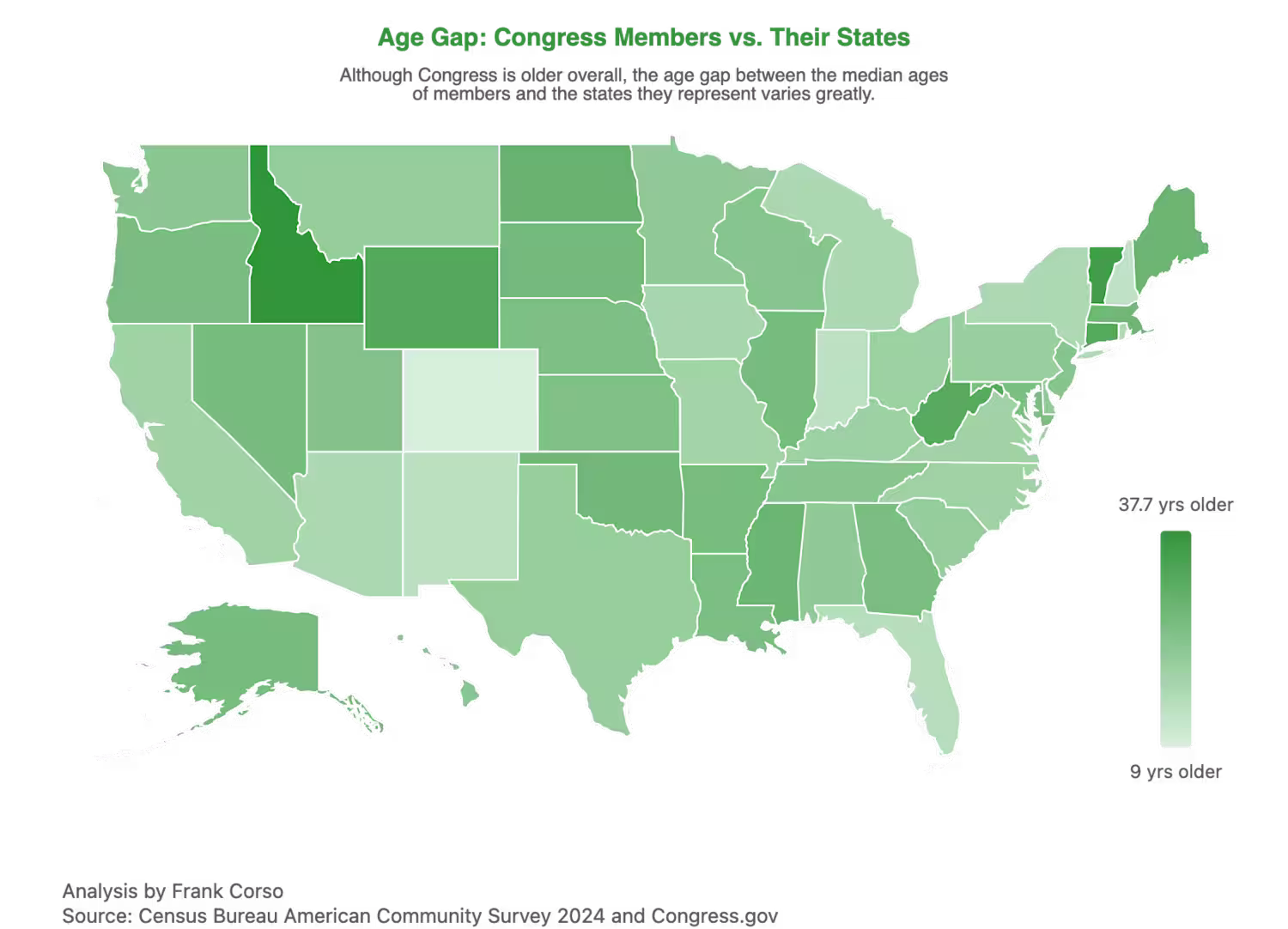 US map showing the difference in median ages between the state's population and the congress members that represent them. Data was collected from Census Bureau csv data and Congress.gov (https://Congress.gov) API. Then data was processed, combined, and restructured to generate needed JSON. Created final interactive chart using Apache Echarts.