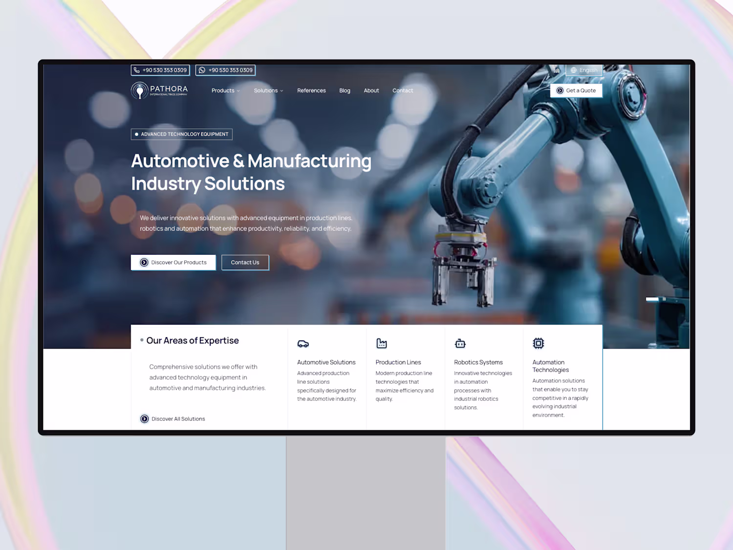 Corporate web design for Pathora, an international trade company specializing in automotive & manufacturing solutions. Clean, dark UI with bilingual support and a conversion-focused layout built to generate B2B leads.