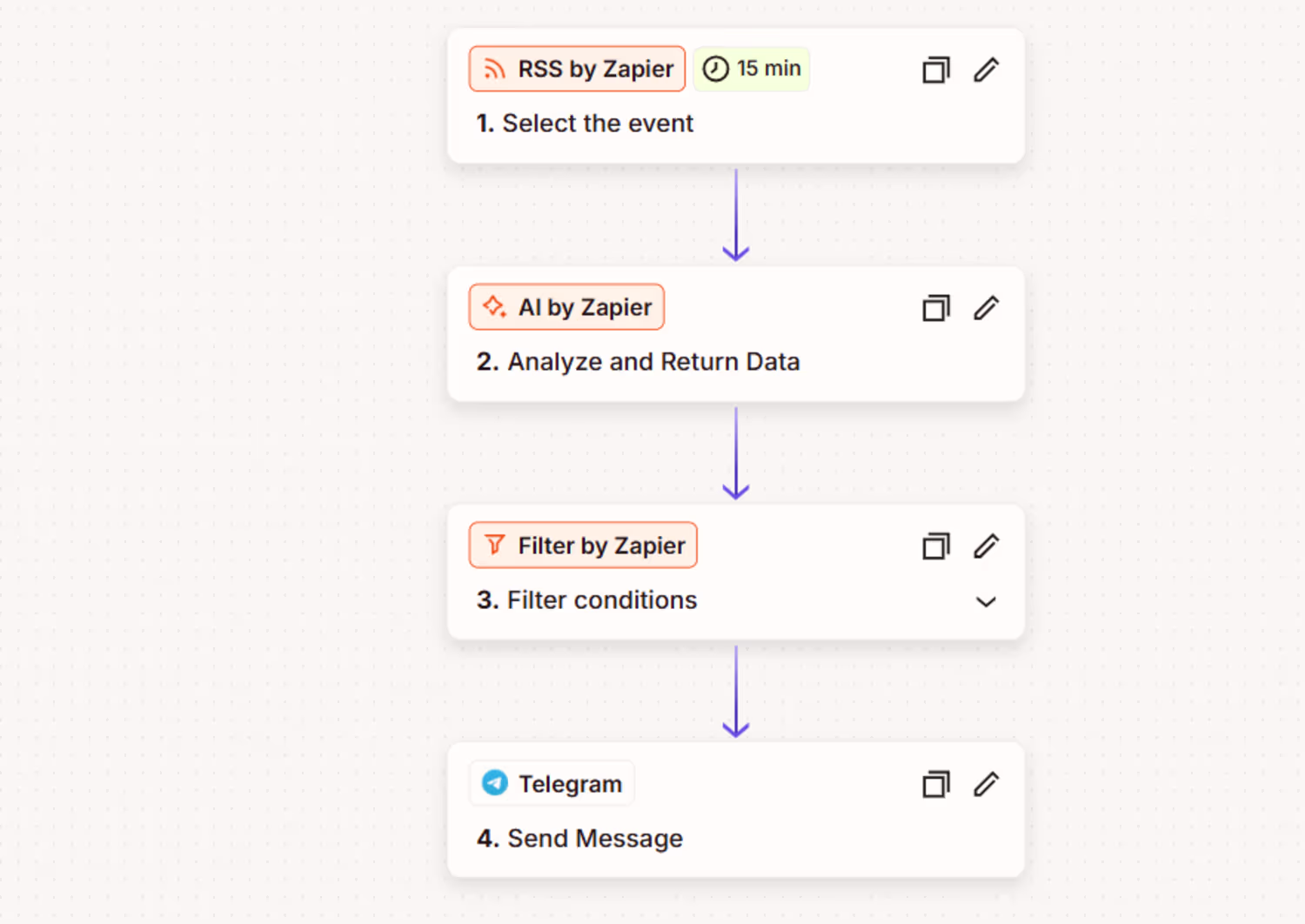 Built an automated workflow that monitors RSS feeds, analyzes content using AI, filters relevant data, and sends updates directly to Telegram.