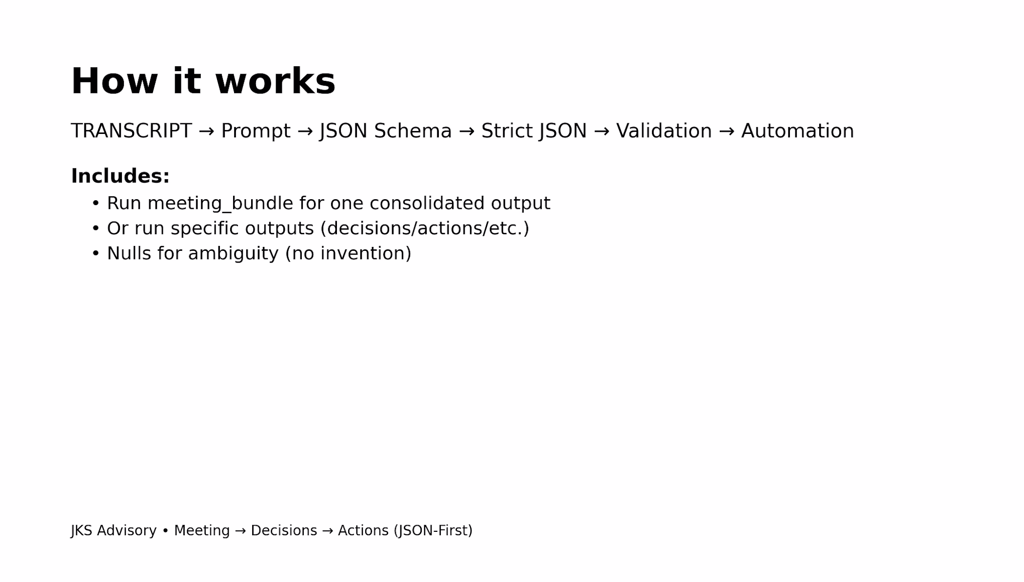 Meeting → Decisions → Actions Executive Pack (JSON-First)
