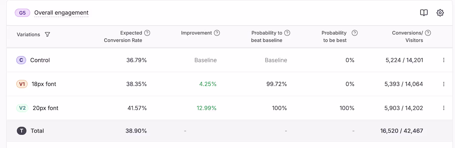 Overall engagement increased 13%, simply from increasing font size from 16px to 20px. KPIs saw improvements ranging from 6% to 10%, with one high value KPI increasing by almost 60%.