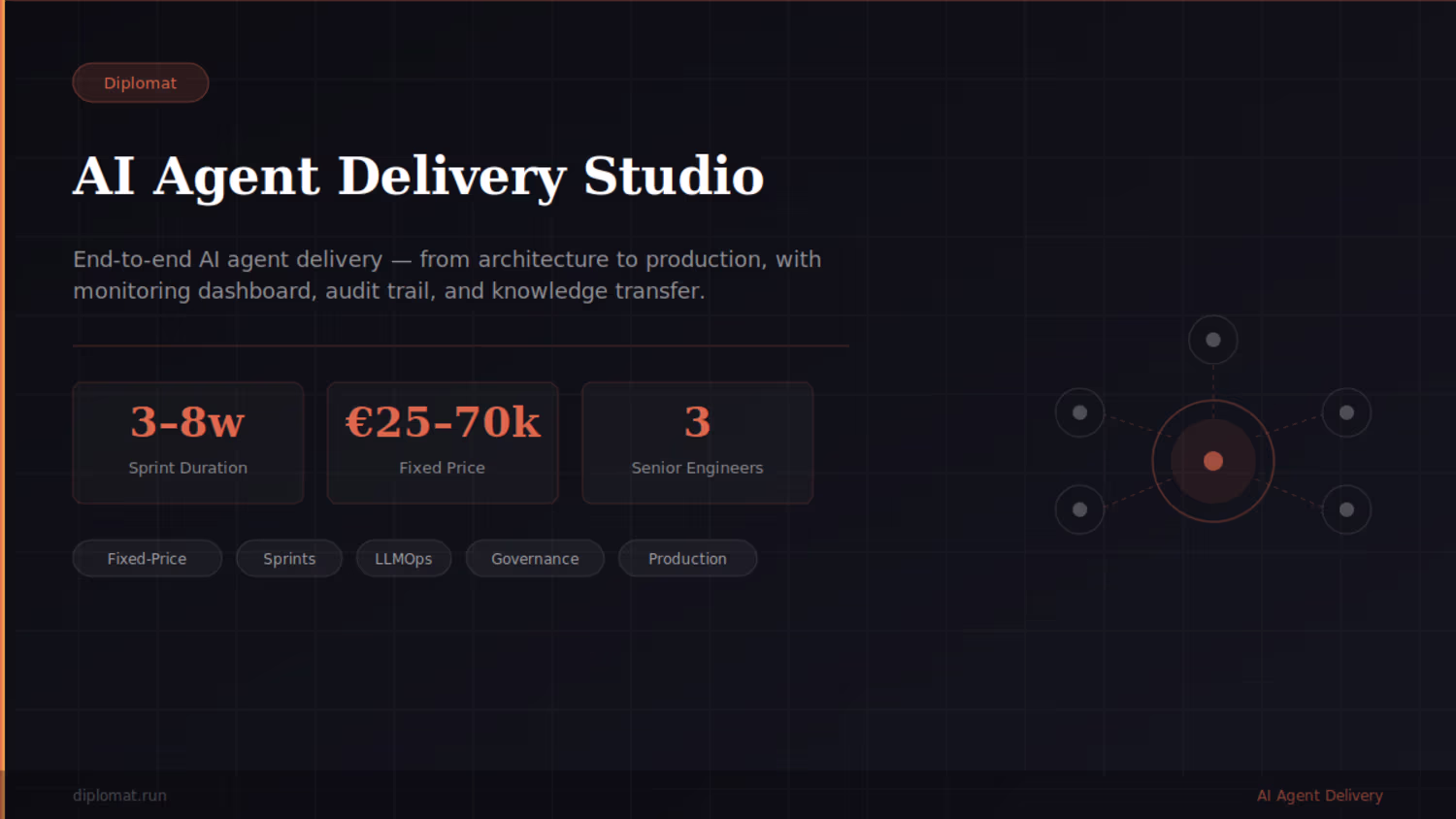 I run Diplomat — an AI agent delivery studio. Fixed-price sprints (3–8 weeks), senior 3-person team, production-grade delivery. Every project includes a monitoring dashboard, audit trail, and knowledge transfer. From architecture to production — no open retainers.