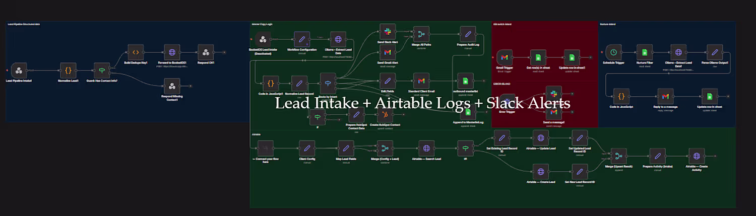Webhook intake → routing → Airtable logs → Slack alerts
