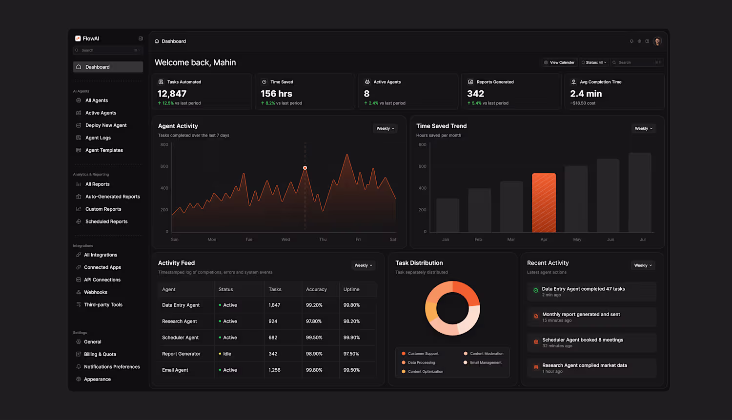 For FlowAI I designed a dark mode AI agent dashboard that gives users complete visibility.