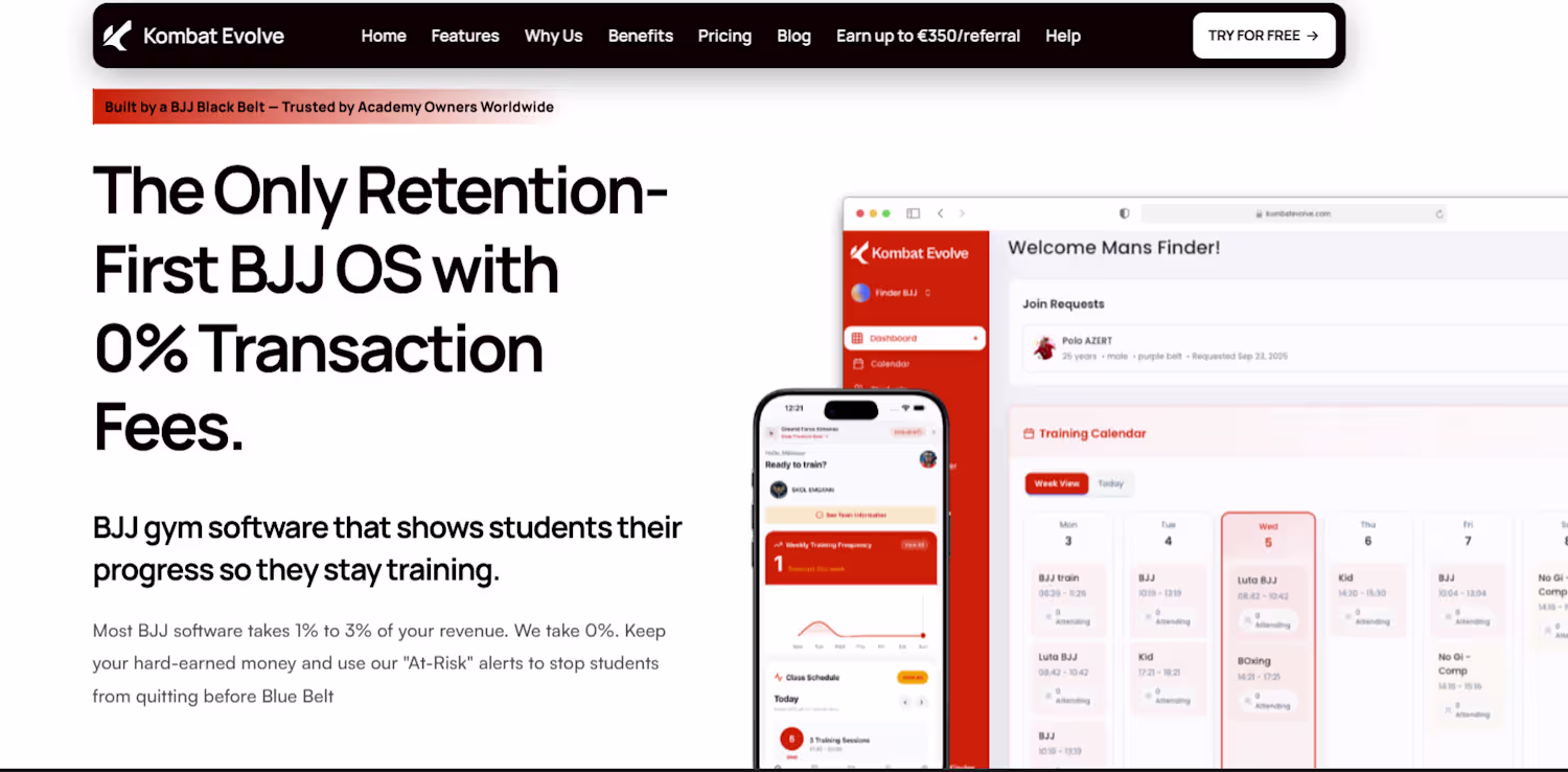 Kombat Evolve—BJJ gym management that cuts admin and keeps students progressing.