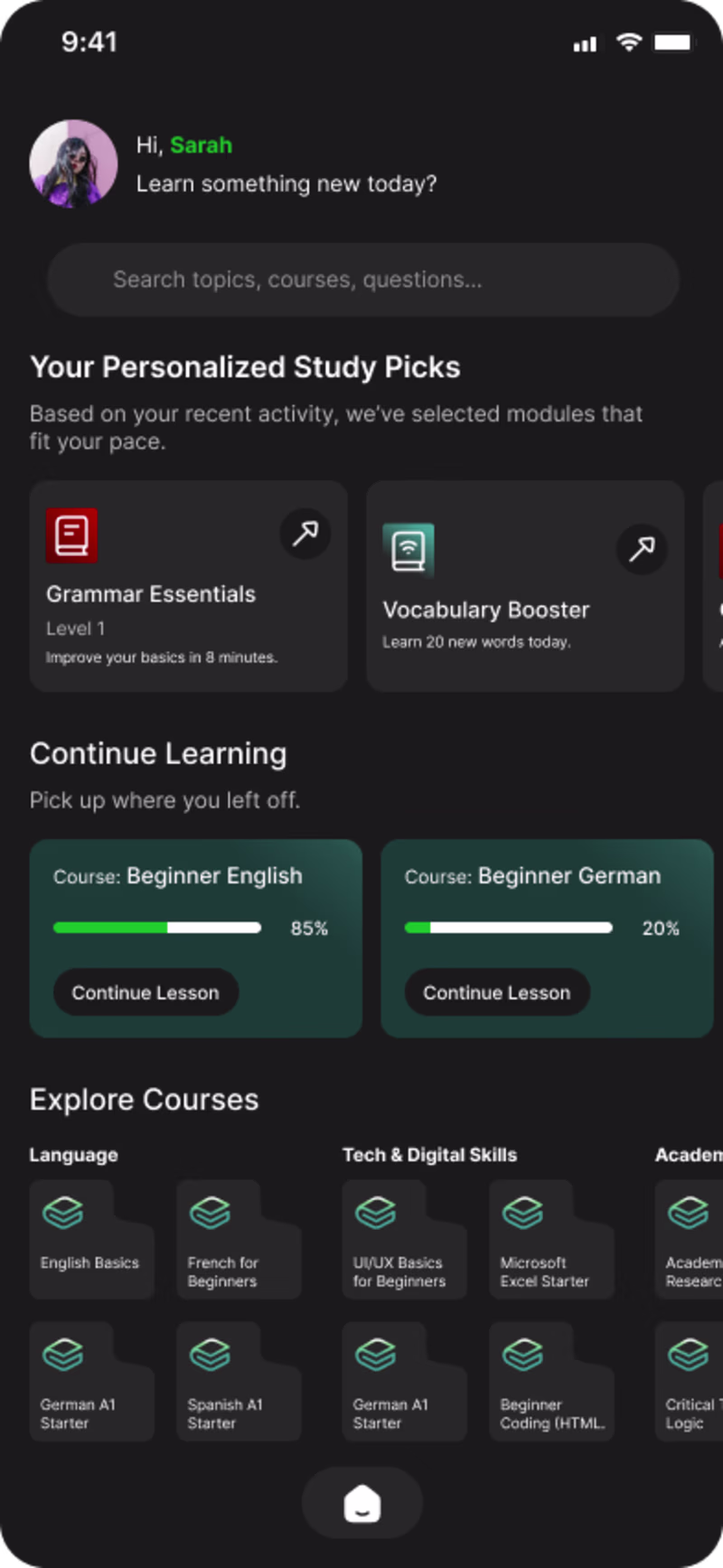 I'm working on the Home Screen for an AI Learning App that adapts to each user’s study journey.