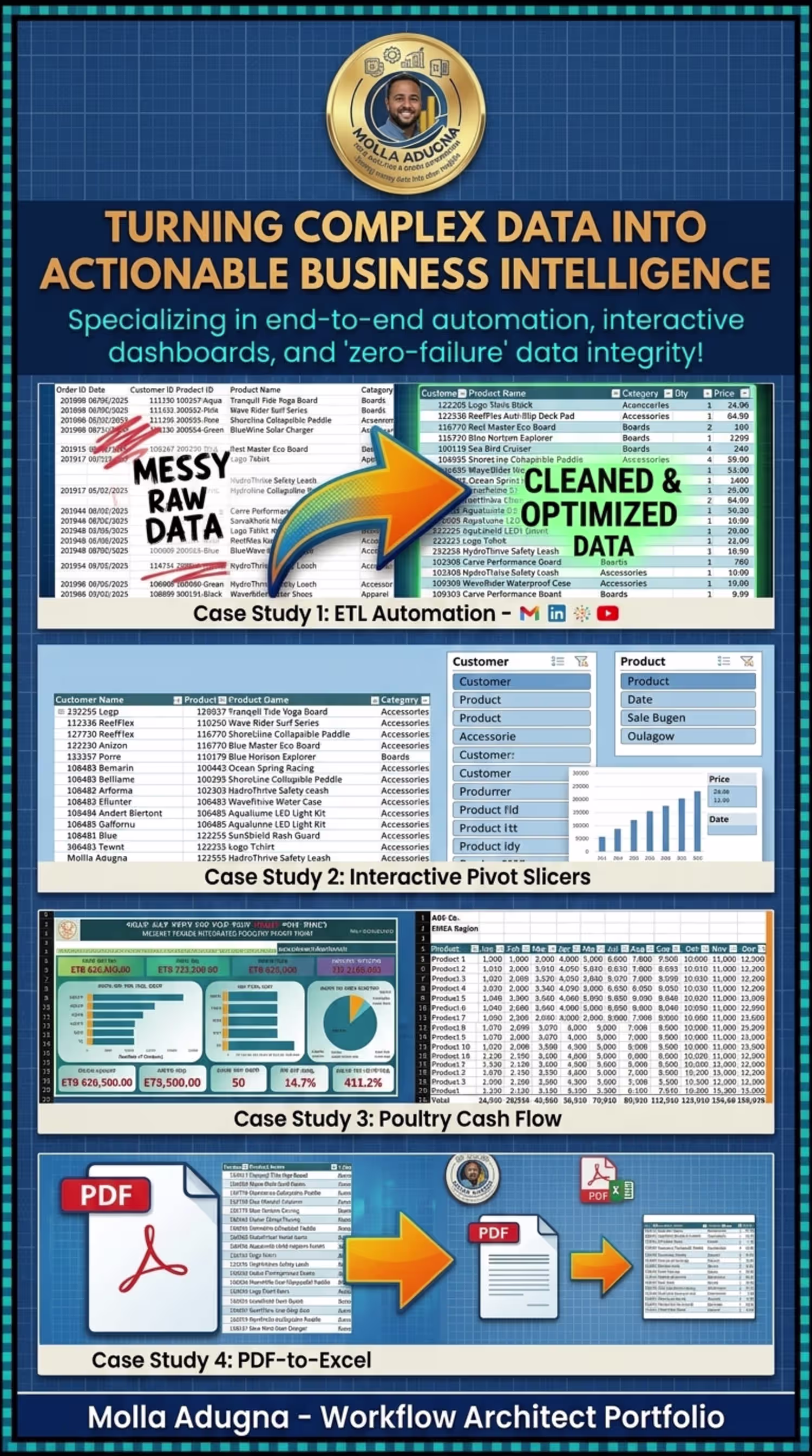 ETL Automation with Power Query Overview: Developed an end-to-end automated ETL (Extract, Transform, Load) workflow to handle messy raw datasets. The Problem: Manual data cleaning was causing significant delays and reporting inaccuracies. The Solution: Leveraged Power Query to automate data ingestion and normalization, transforming raw data into analysis-ready formats. Outcome: Eliminated manual effort and ensured 100% data accuracy for downstream reporting. Tools: Excel, Power Query (M-Code).