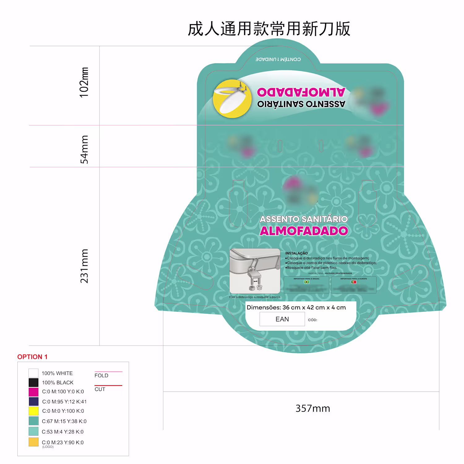 Artwork + Dieline for toilet seat packaging (Imported from Asia to Brazil).
