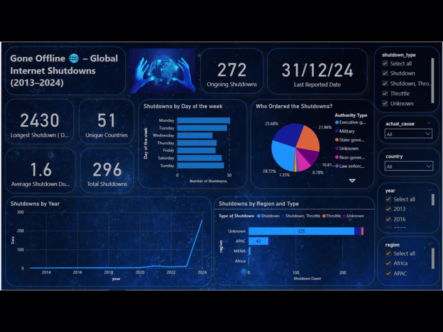 I analyzed global internet shutdown data to understand where, when, and why shutdowns happen. The goal was to uncover patterns across countries and time periods and highlight their impact on digital access.