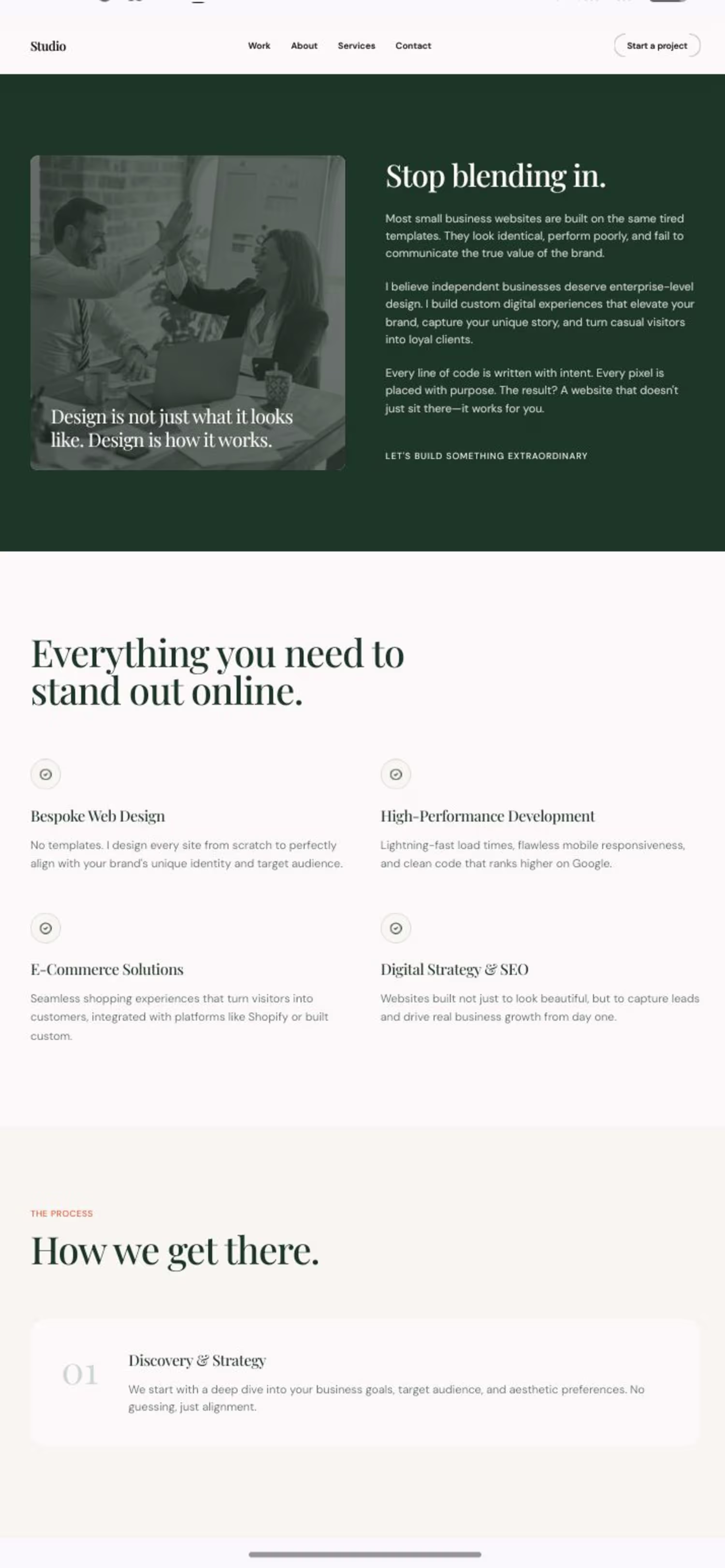 This project showcases my comprehensive design and development process for independent businesses. Moving beyond standard templates, I focus on 'Enterprise-Level' design that prioritizes brand storytelling and technical performance. The workflow includes a deep-dive Discovery & Strategy phase, High-Performance Development for lightning-fast speeds, and a commitment to bespoke UI/UX that ensures my clients never 'blend in' with the competition. Built with intent on Replit."