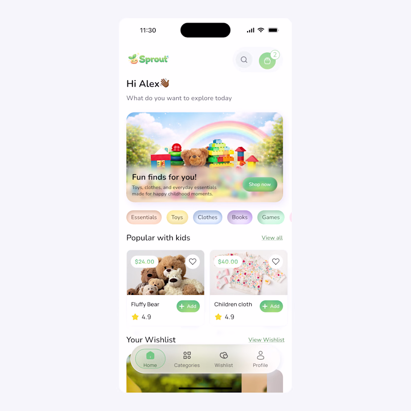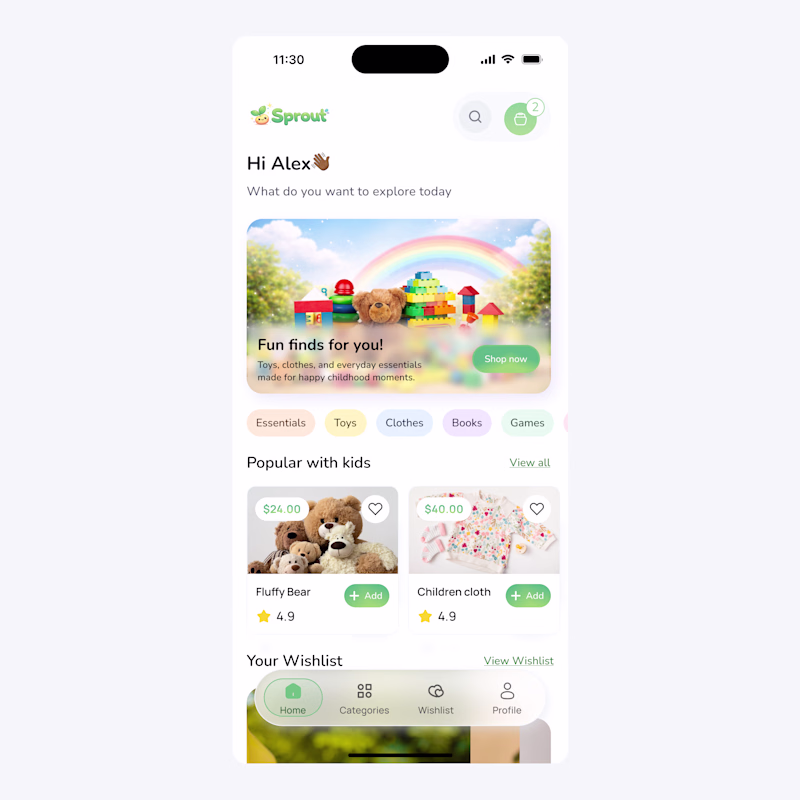 This kids ecommerce app concept explores how thoughtful UI/UX design can balance playfulness and practicality.