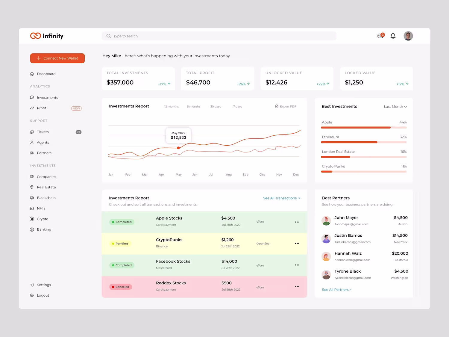 Comprehensive investment dashboard unifying stocks, crypto (e.g., CryptoPunks), NFTs, and real estate. Features personalized metrics ($357K portfolio, +$46K profit), transaction history, performance charts, and partner tracking in a vibrant, data-rich layout.