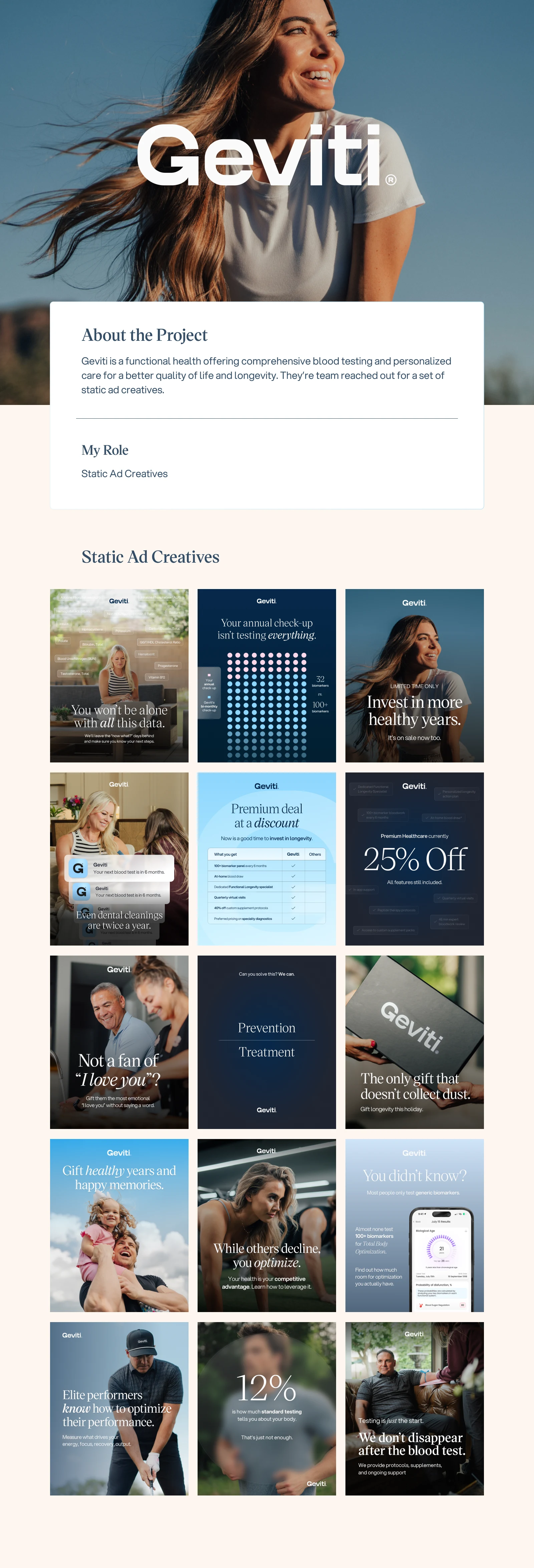 Functional health offering comprehensive blood testing and personalized care for a better quality of life and longevity. The project was 15 ad creatives.