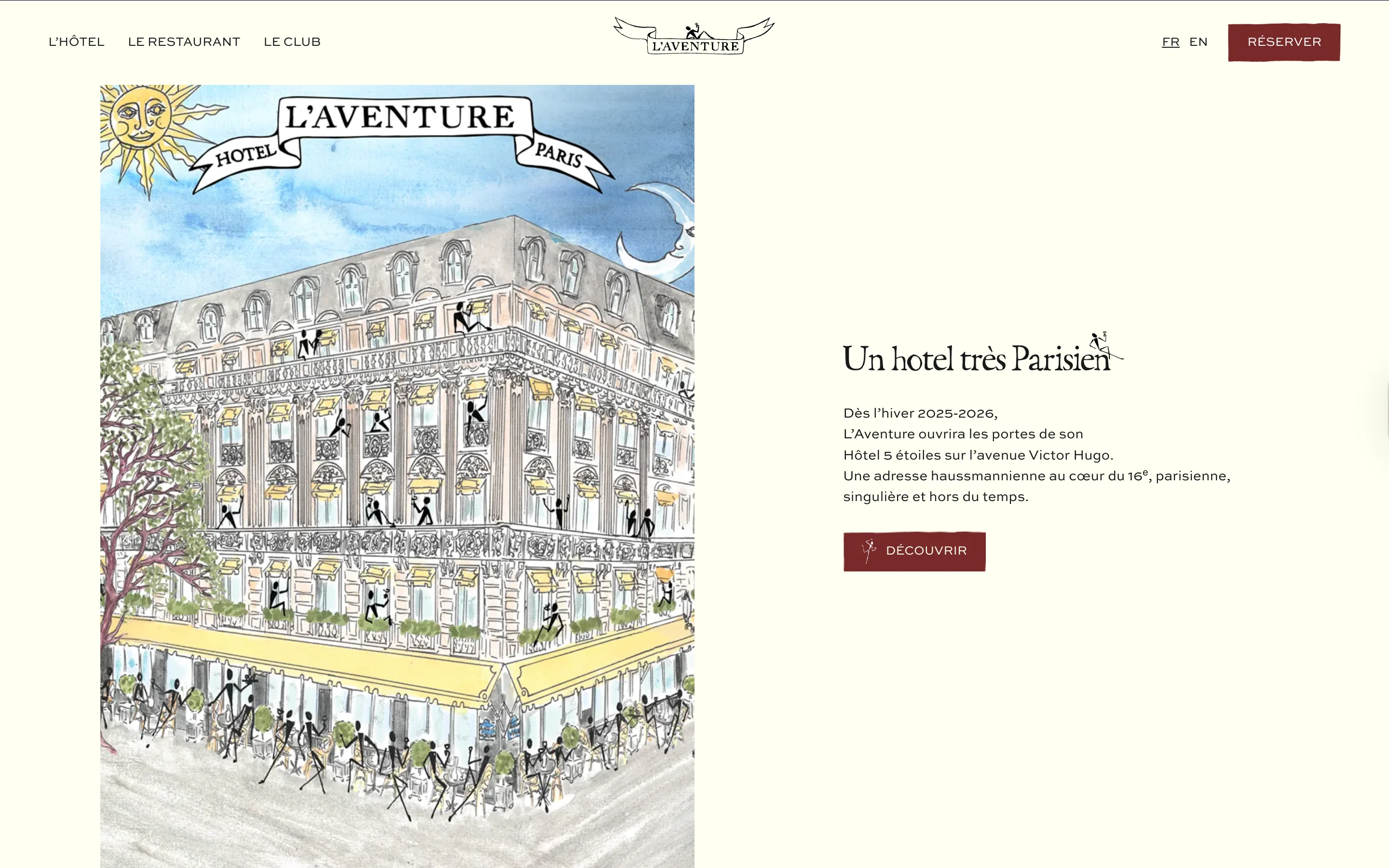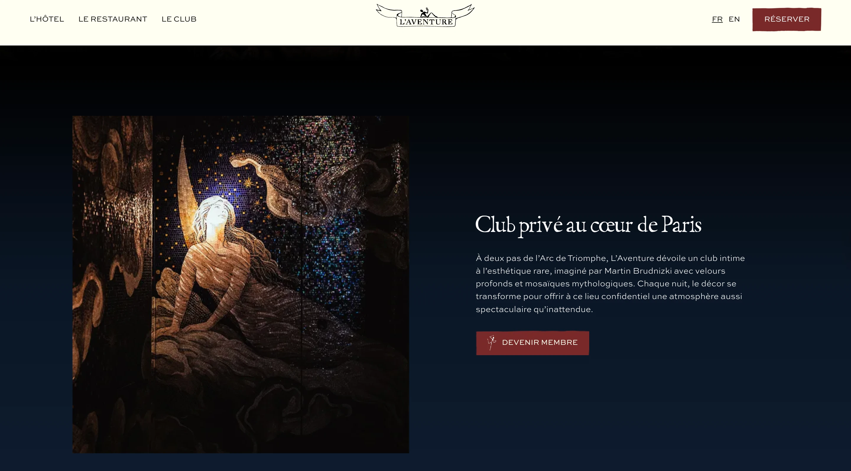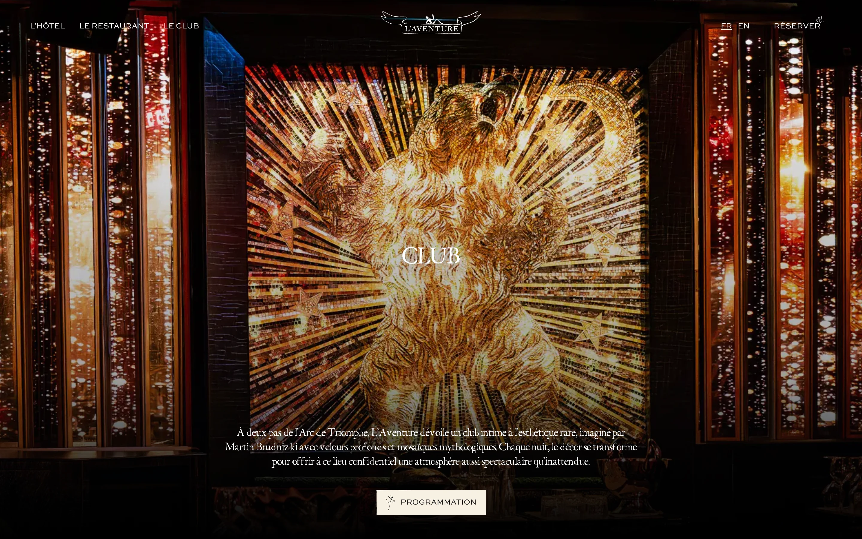 I designed L'Aventure's website as a visual journey through Parisian luxury. The layout balances editorial sophistication with intuitive navigation, guiding visitors through the Hotel, Restaurant, and Club experiences. Rich imagery, refined typography, and generous white space evoke the venue's Art Deco-meets-contemporary aesthetic, while strategic CTAs drive reservations and membership inquiries.