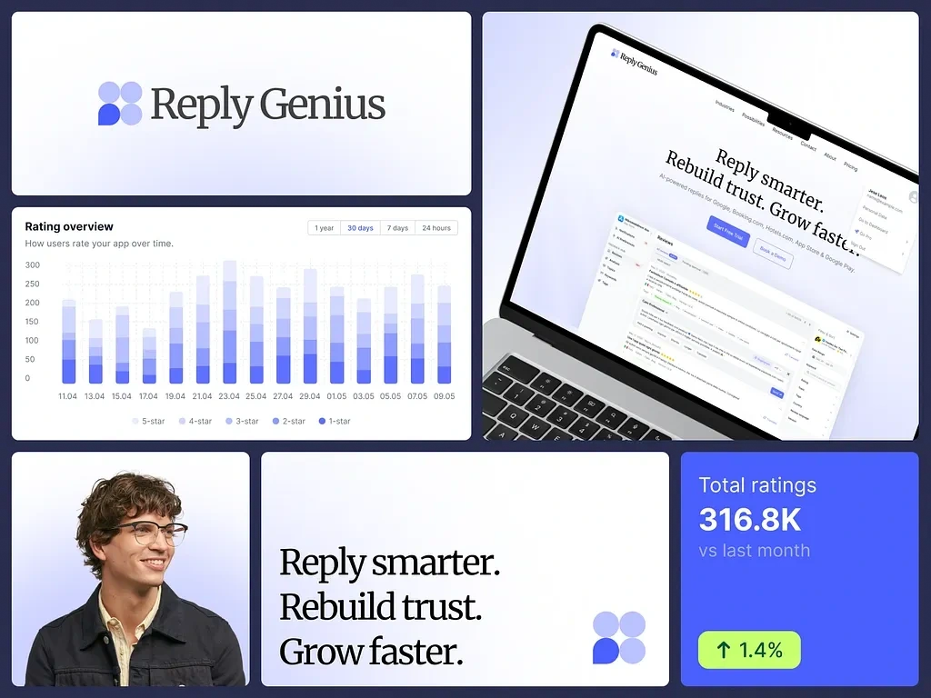 We built ReplyGenius as a working system for teams that operate inside a constant flow of reviews. Context, replies, analytics, and role management are brought together in one structure, creating a continuous and coherent workflow.The identity, interface, and product logic move in the same direction. The result is a tool that helps teams keep communication organized, make decisions based on real signals, and build trust through consistent, thoughtful interaction.