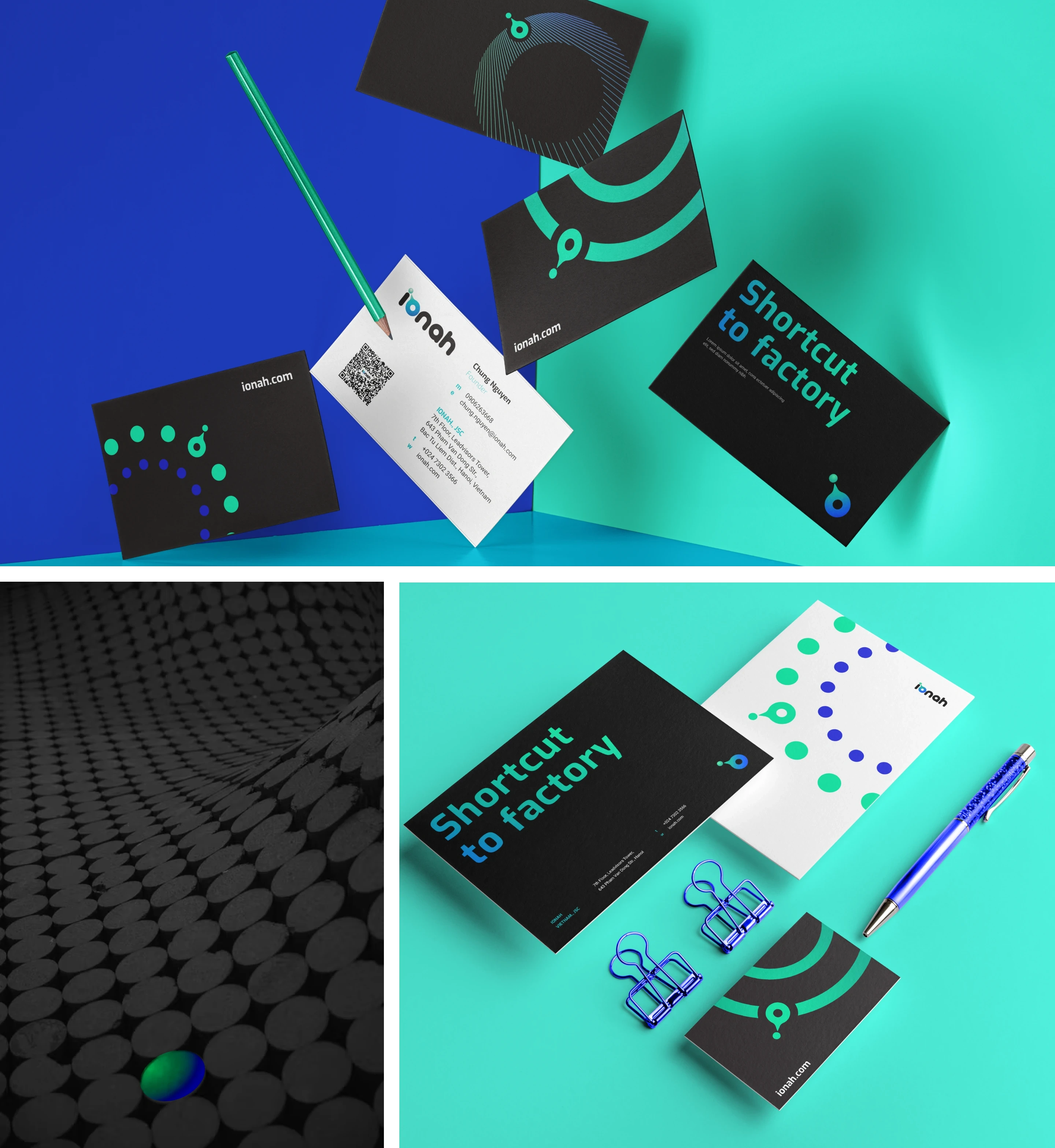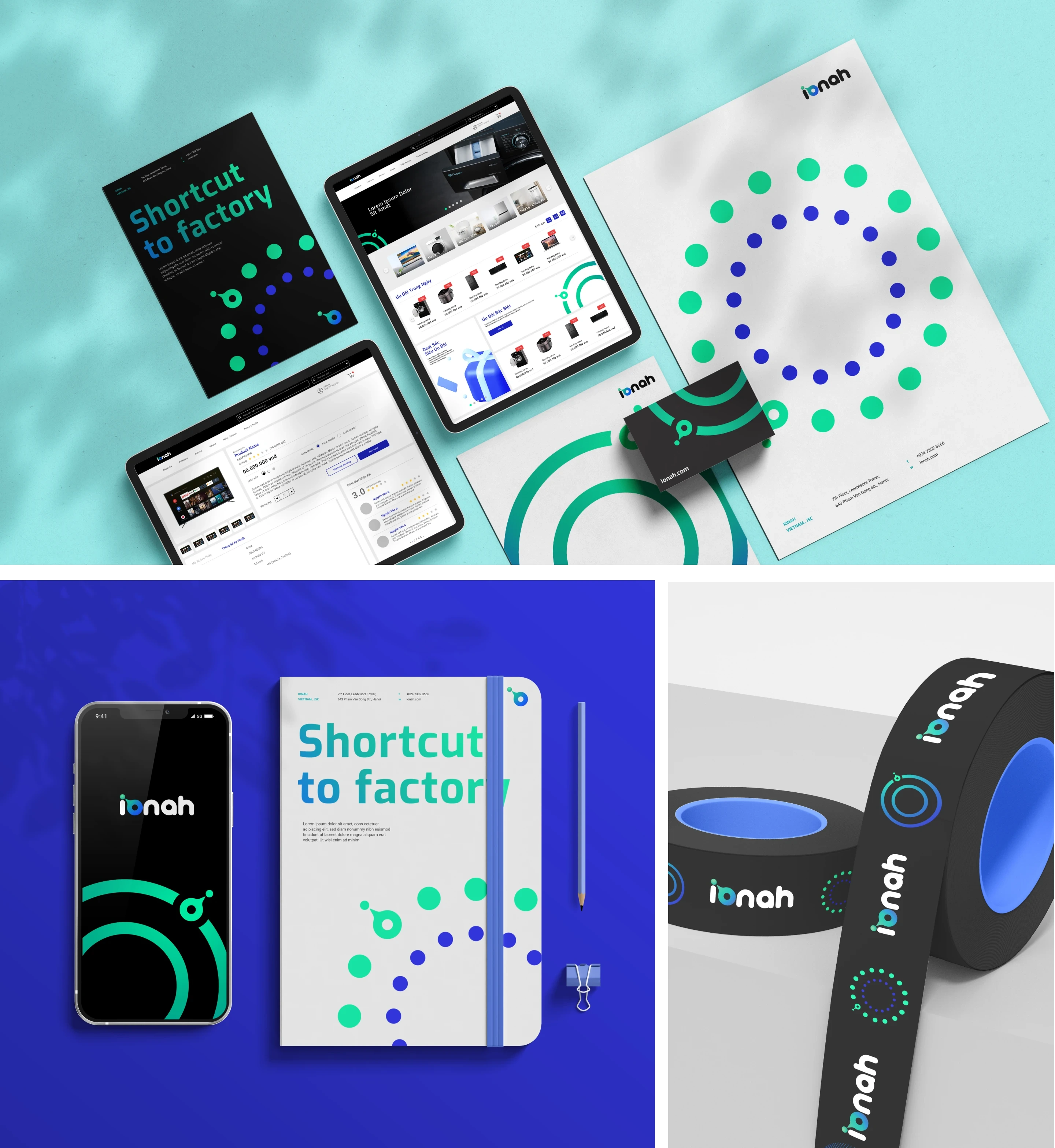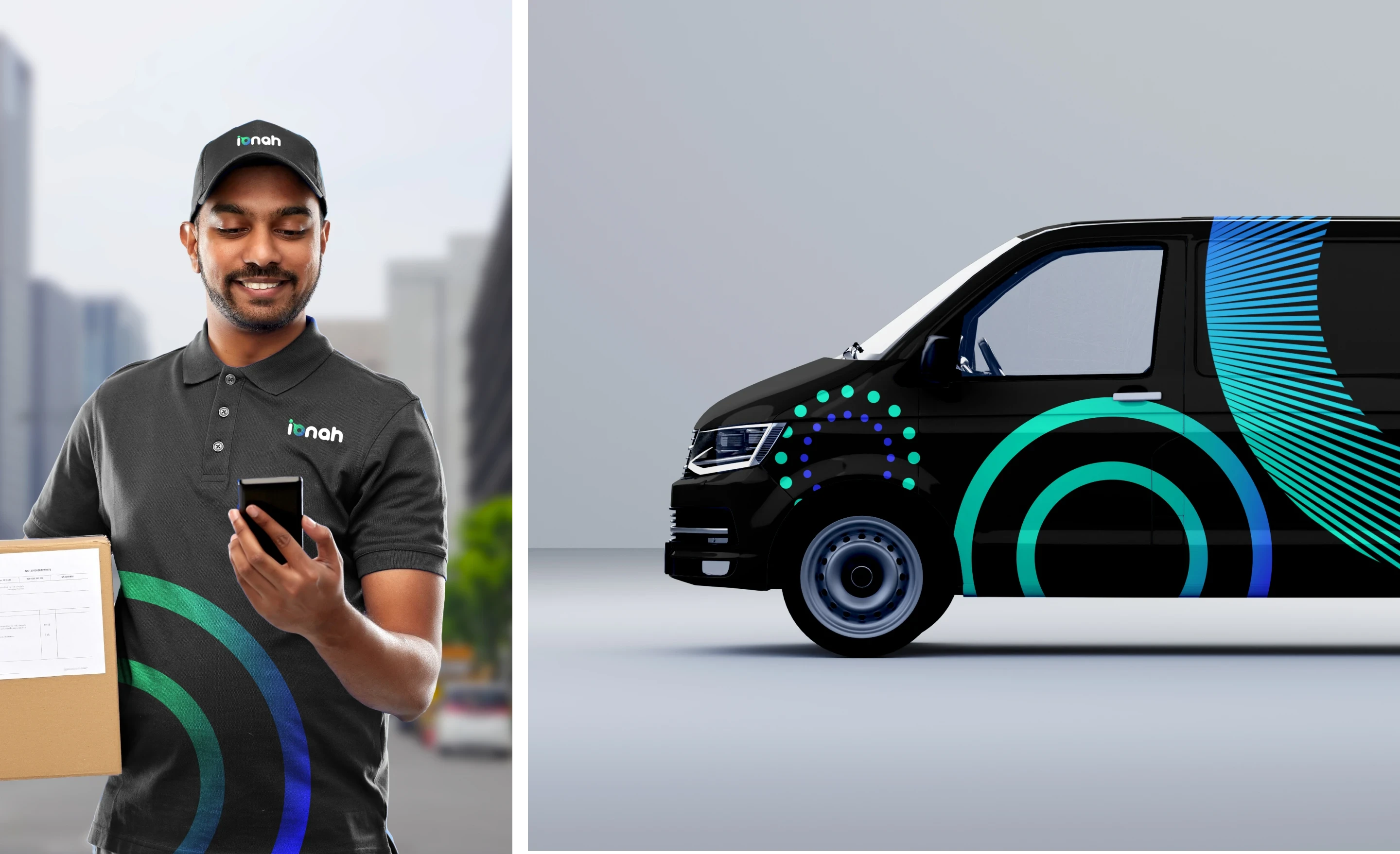 The logo is inspired by an atom image (with proton & neutron subatomic particles in the centre and electrons orbiting the nucleus). We also want to hint a radar image, taken from the 'real-time tracking' feature of the ionah ecommerce platform. We want to emphasise the use of AI technologies to optimise delivery speed, we make sure the look and feel of the brand is 'technology' and 'innovative'.