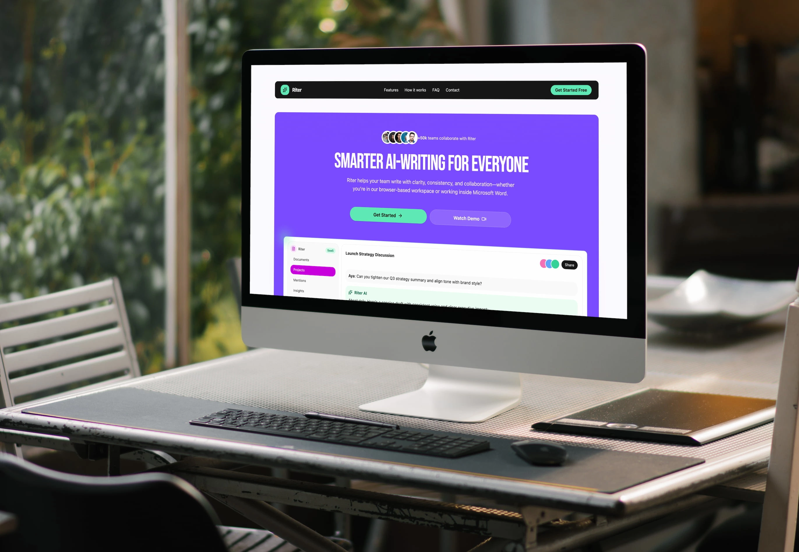 The solution needed to address typical pain points like easy to use writing helper, onboarding anxiety, collaboration complexity, and enterprise data security concerns - by making it clear how Riter integrates with incumbent workflows (Browser, Word plugin) and supports both small teams and growing businesses. Solving this meant juxtaposing technical robustness (SaaS, secure cloud, SSO, and real-time collaboration) with a clean, approachable user experience that prevails in a competitive market where trust and perceived ease-of-use drive conversions.