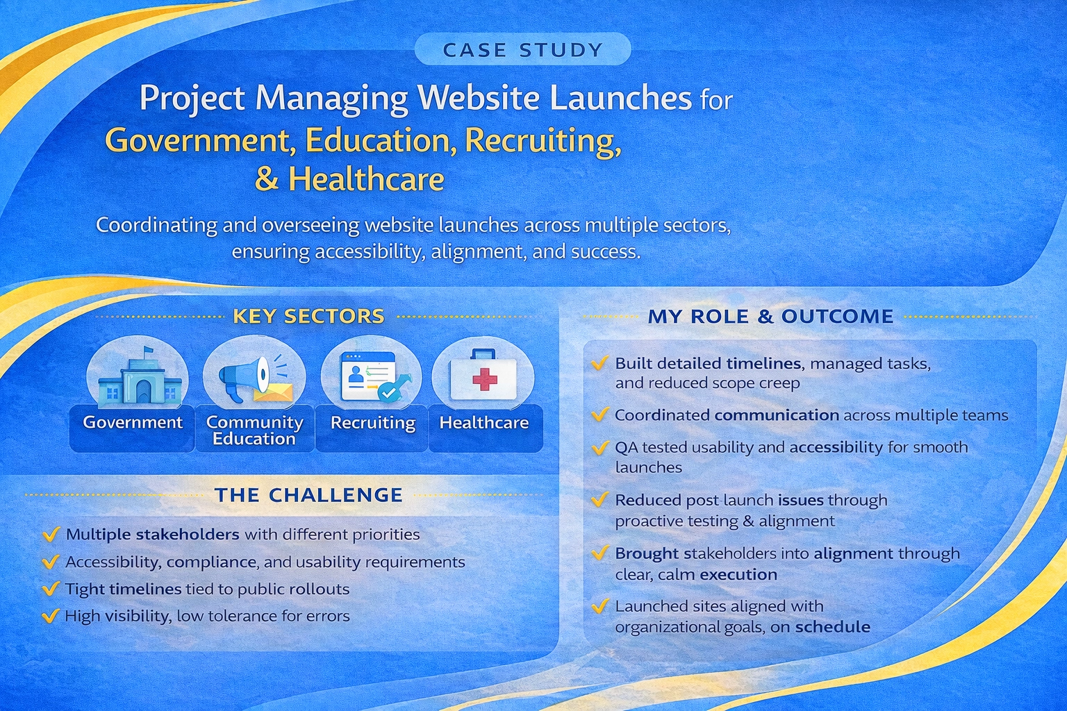 Managed high-visibility website launches across multiple sectors, aligning teams, reducing risk, and delivering a smooth, on-time go-live.