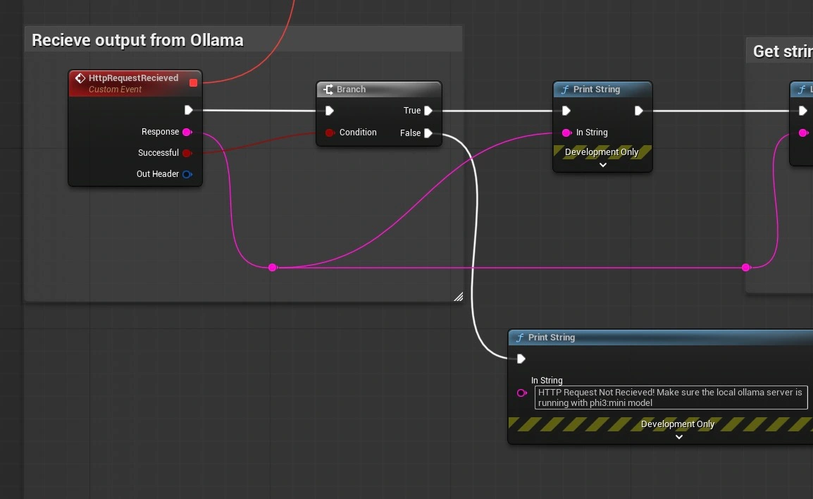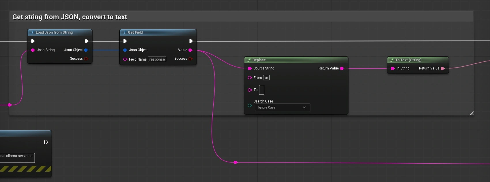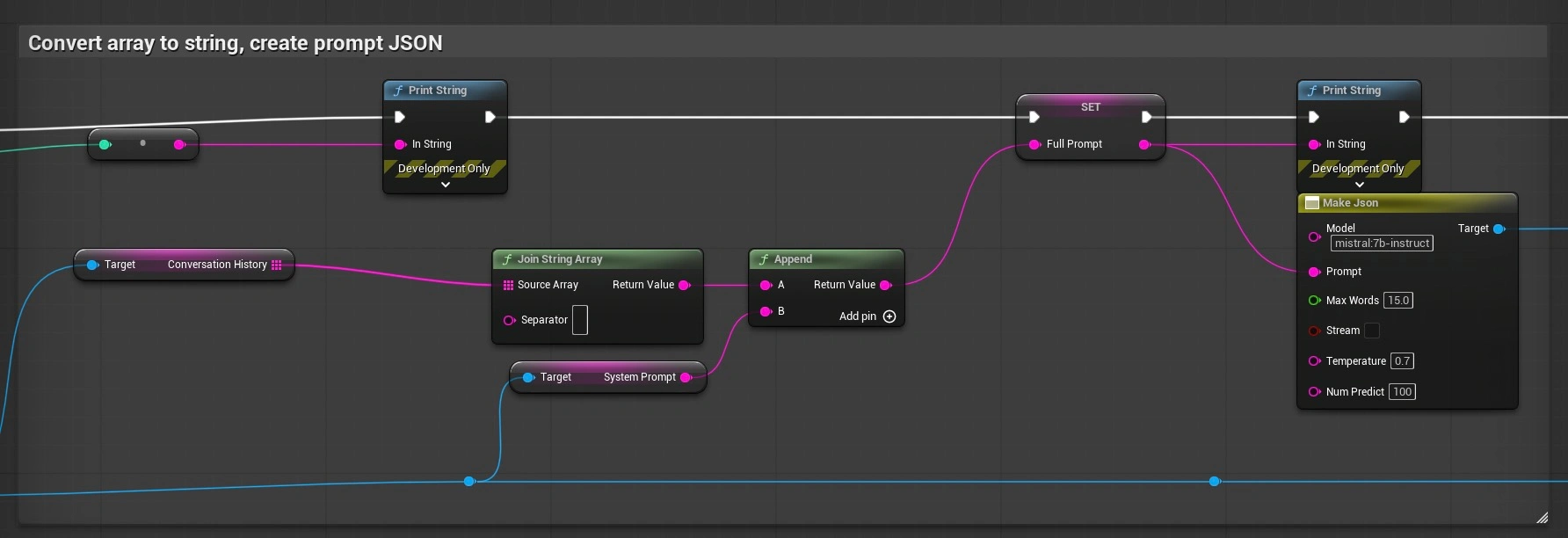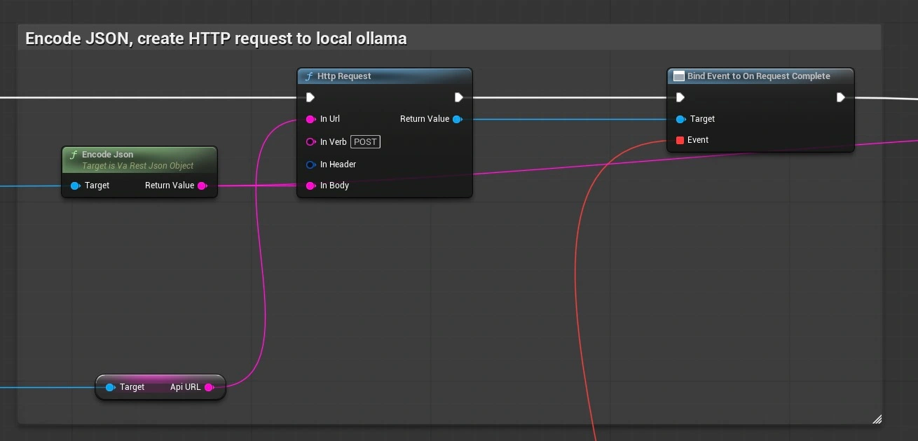 To do this, first we encode the JSON prompt, feed it into a HTTP request node as its body, feed the API URL from BP_Ollama into the in URL, and label the In Verb as POST.