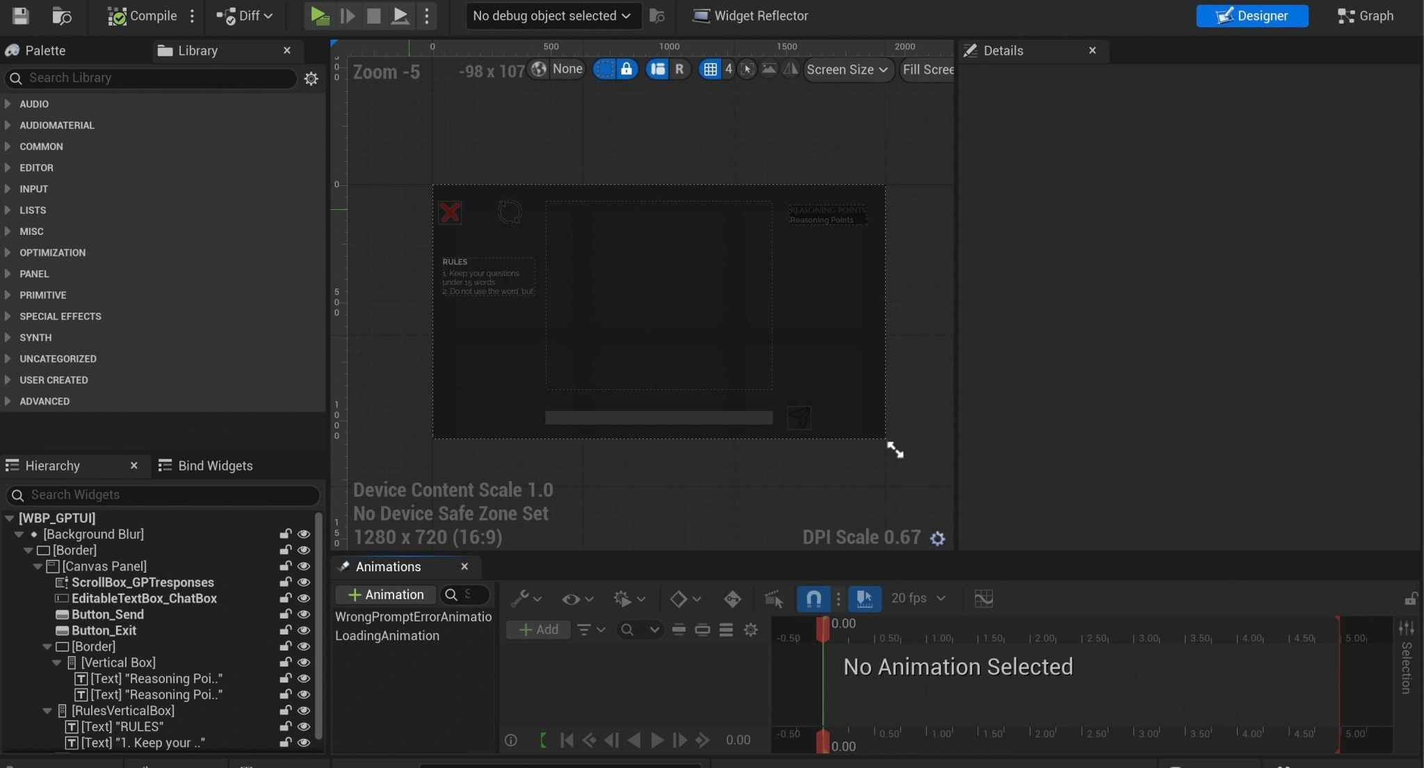 From now on, all the blueprints will be done in the WBP_GPTUI widget UI. All these blueprints are plugged into the send button.