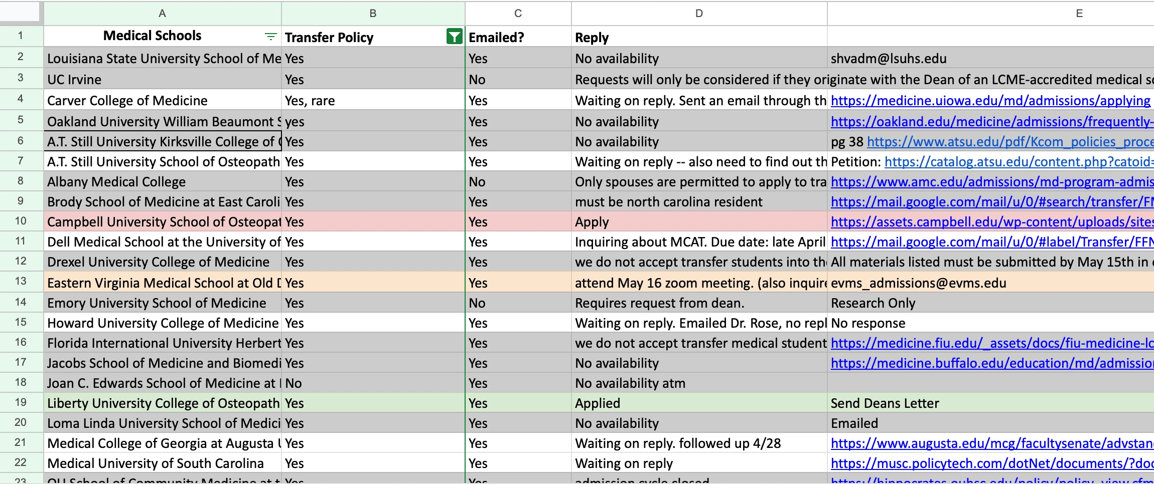 I looked up transfer policies and emailed hundreds of schools to verify if they were accepting transfers.