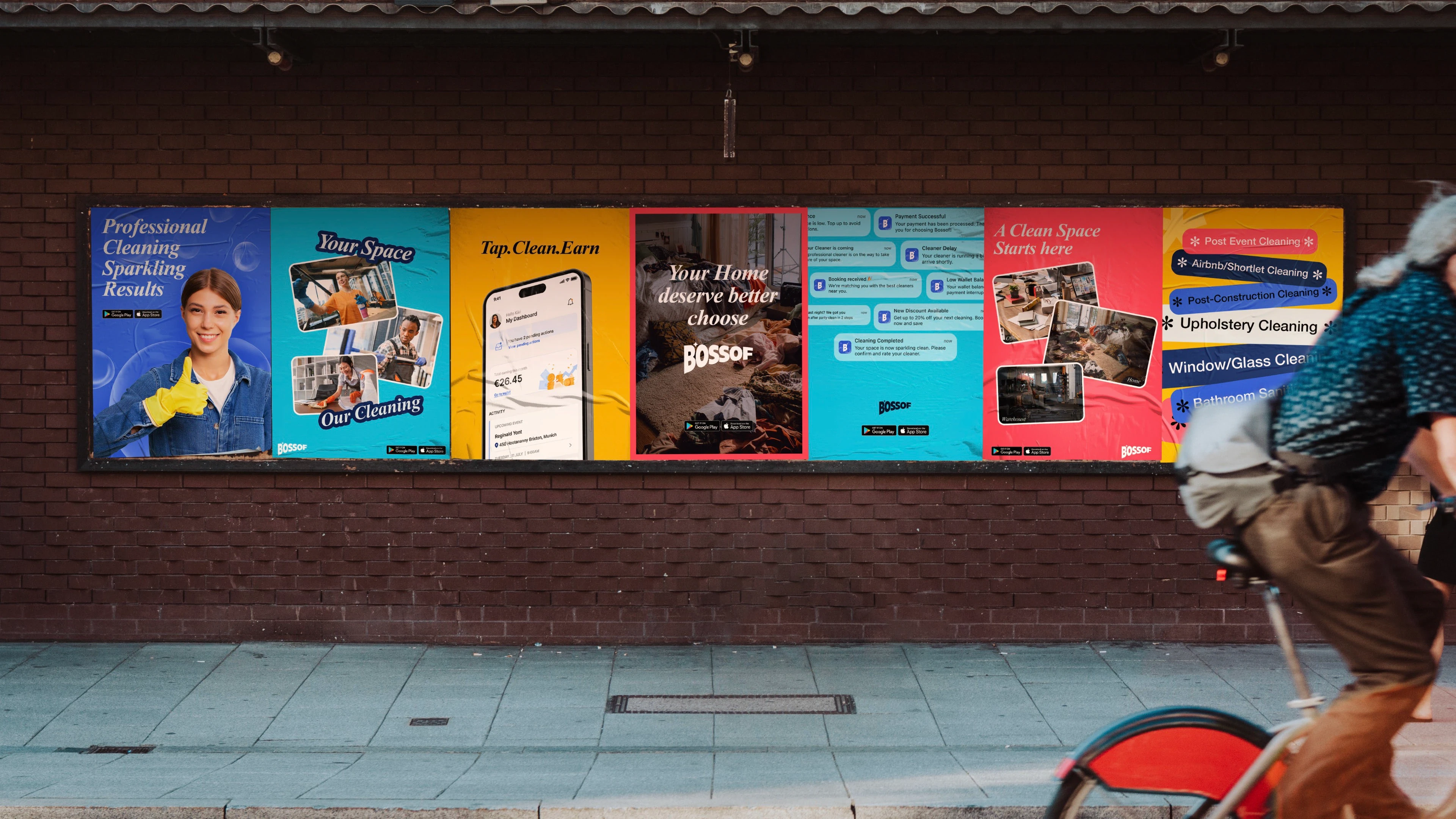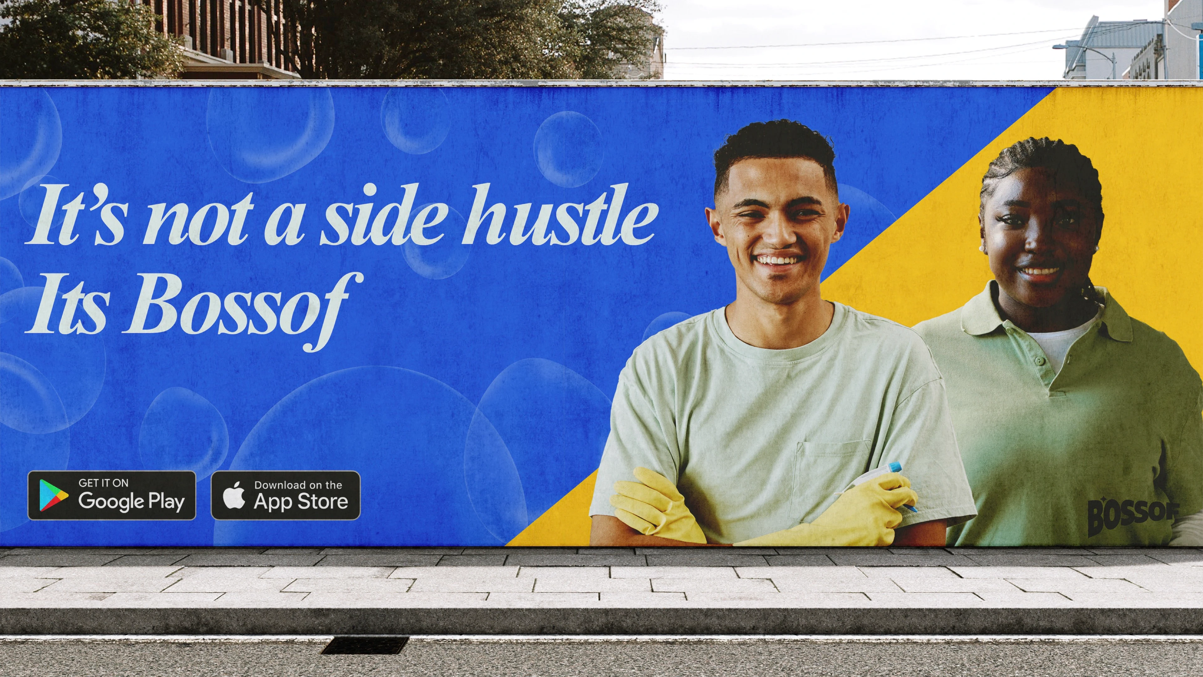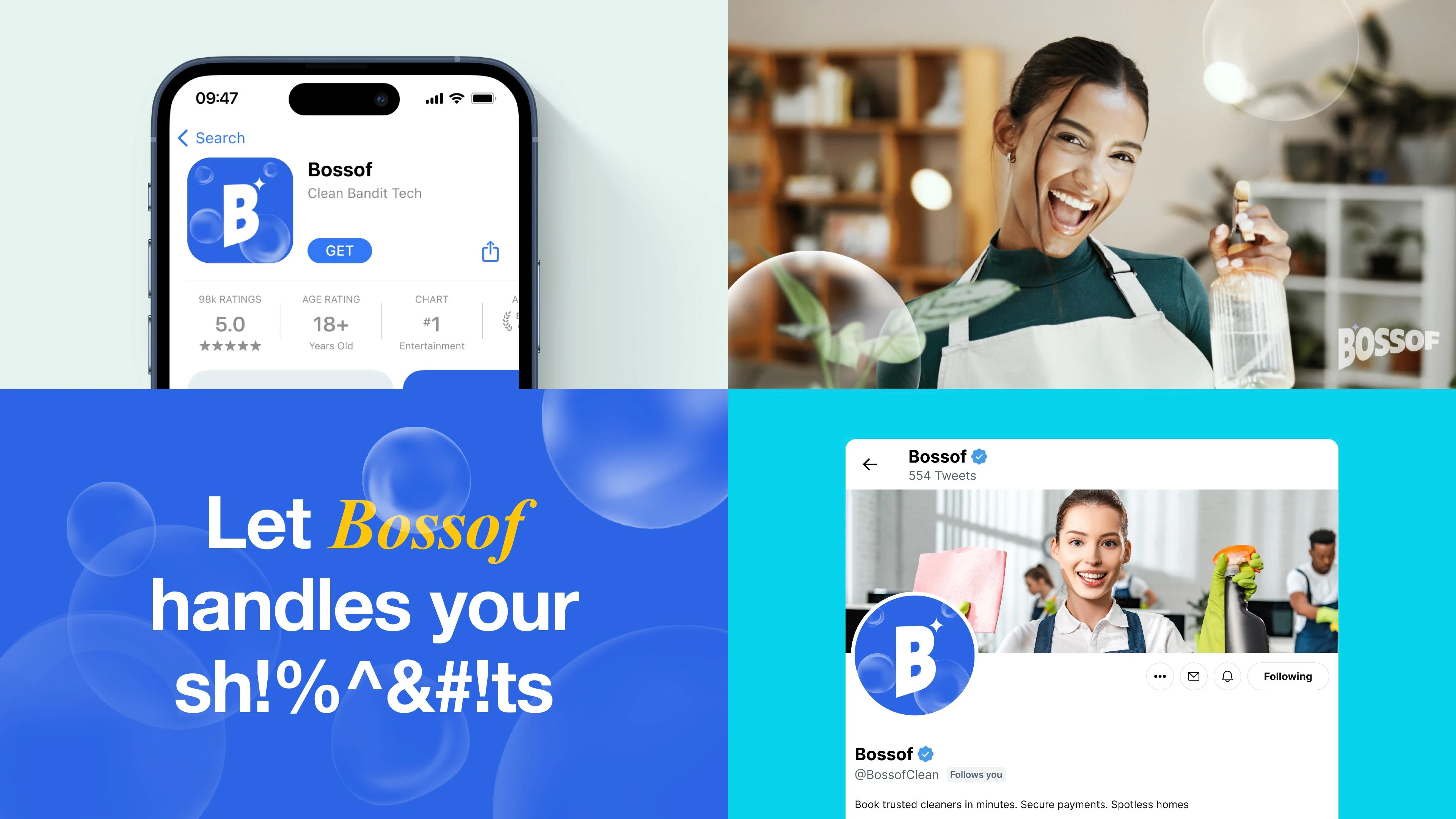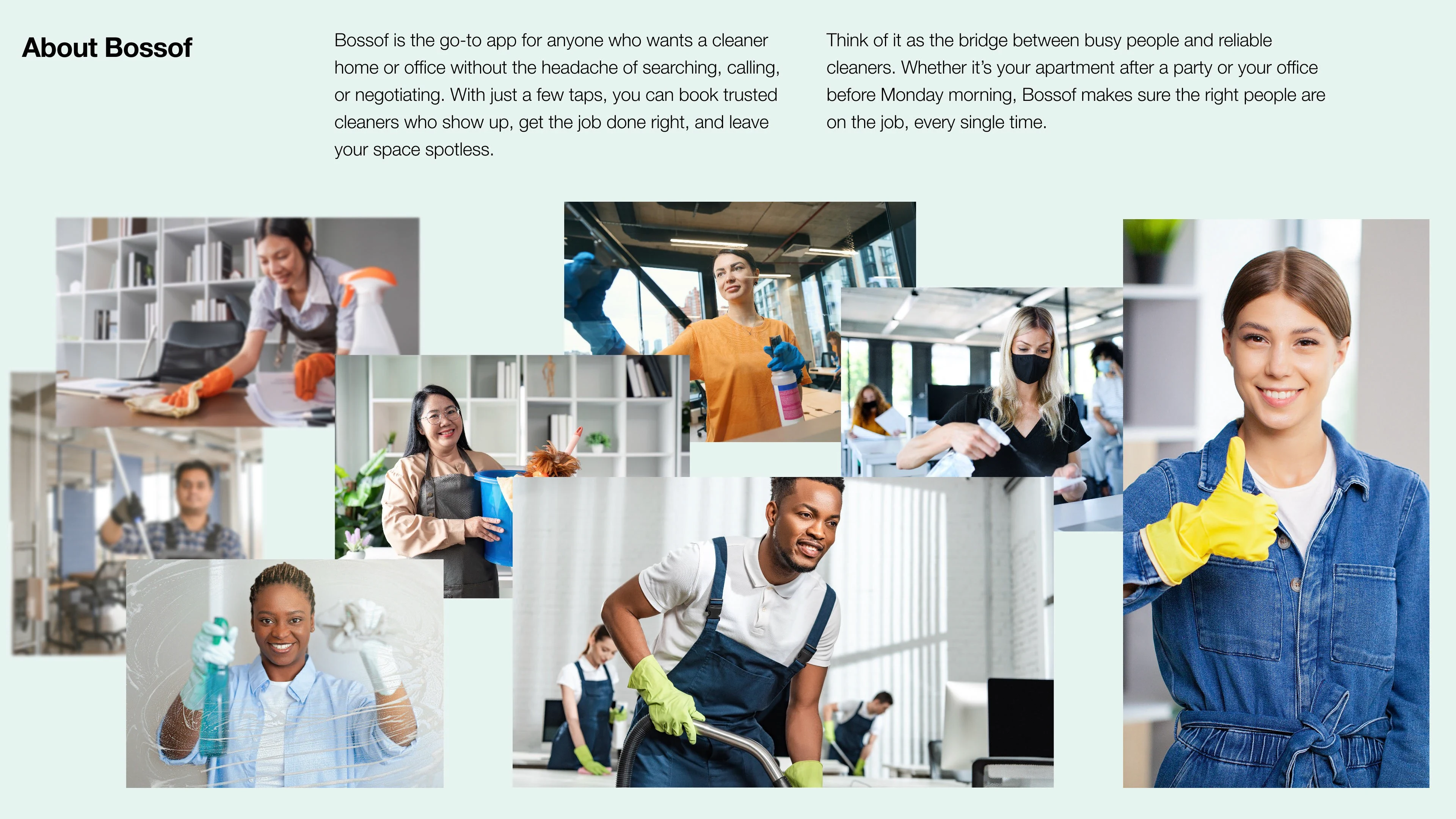 Brand, UX, motion design and Brand Strategy for Bossof an app for anyone who wants a cleaner home or office or Warehouse etc.