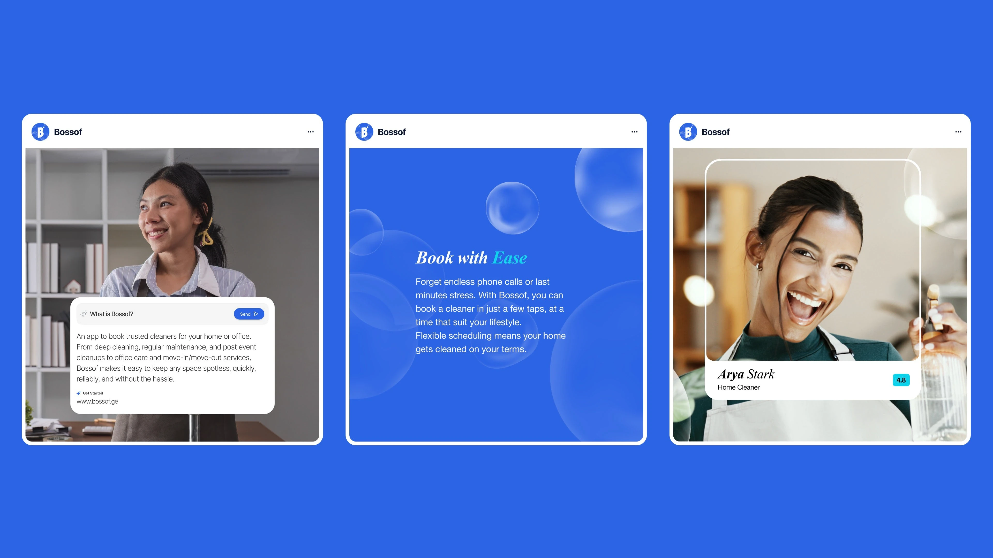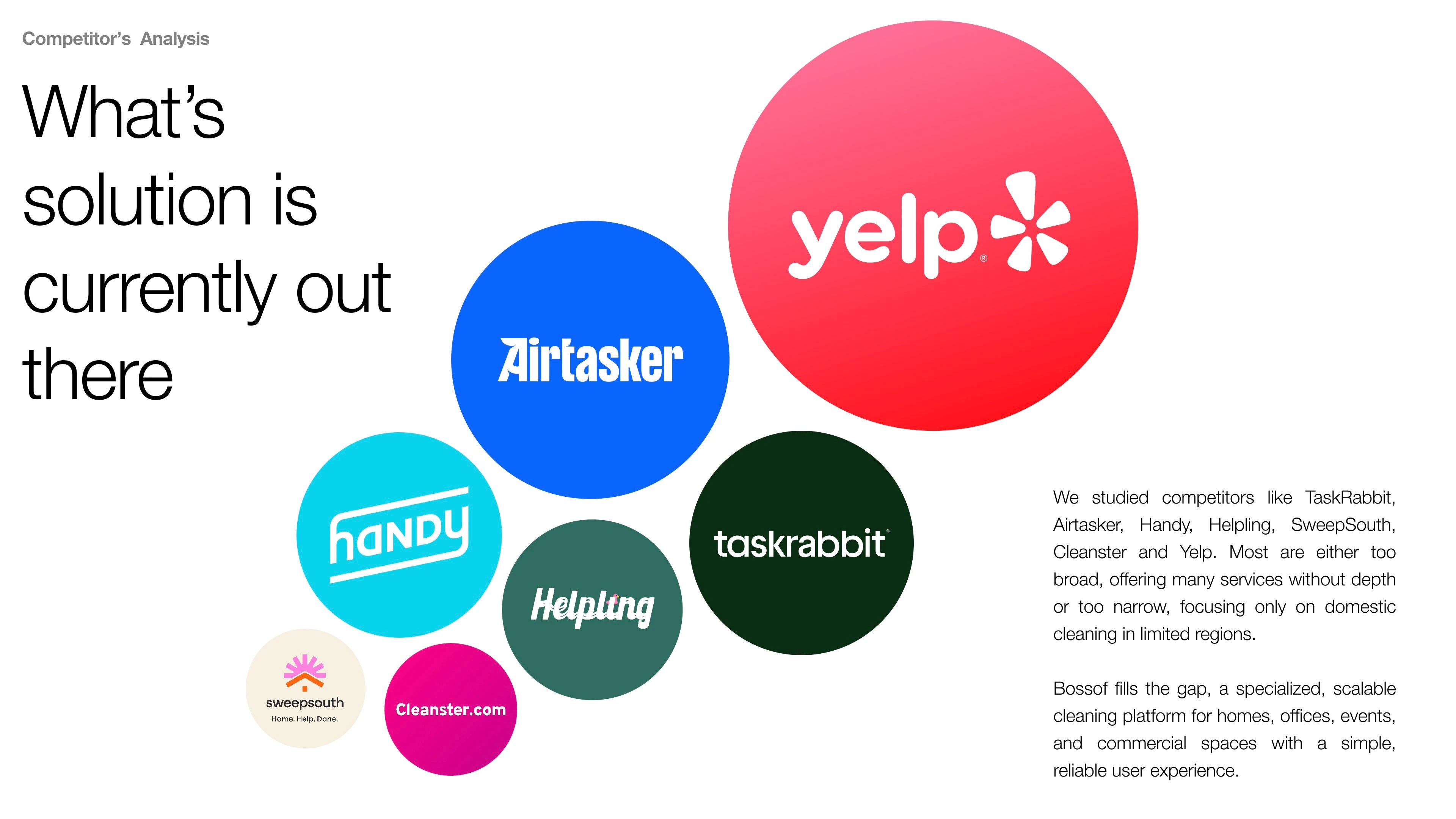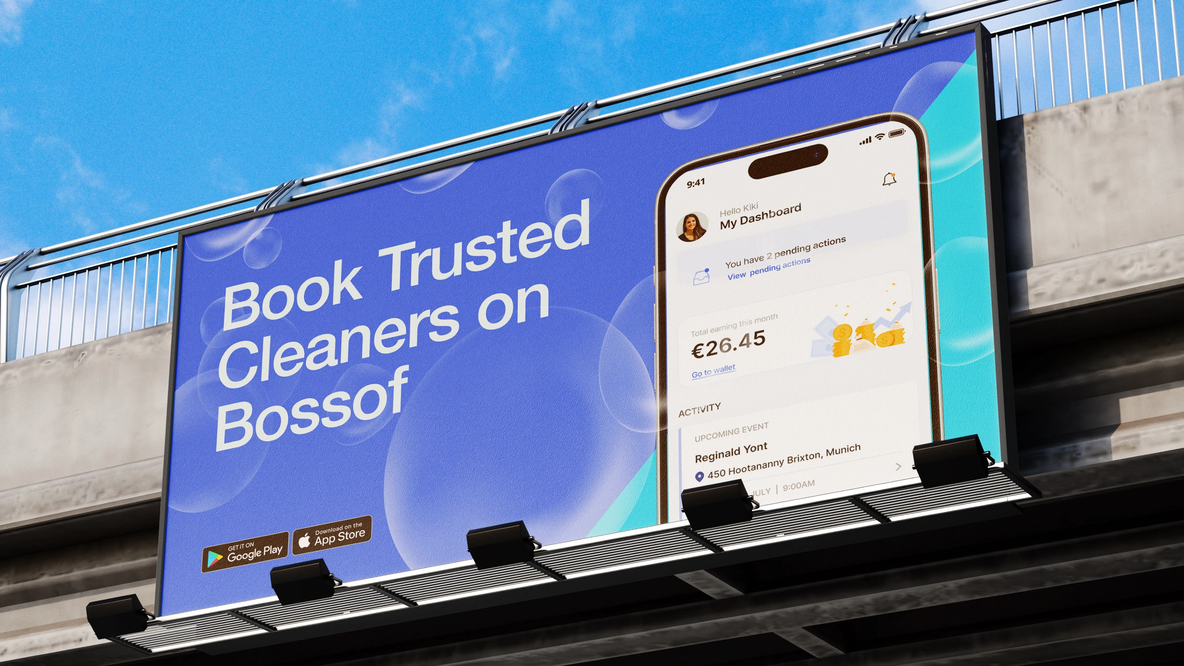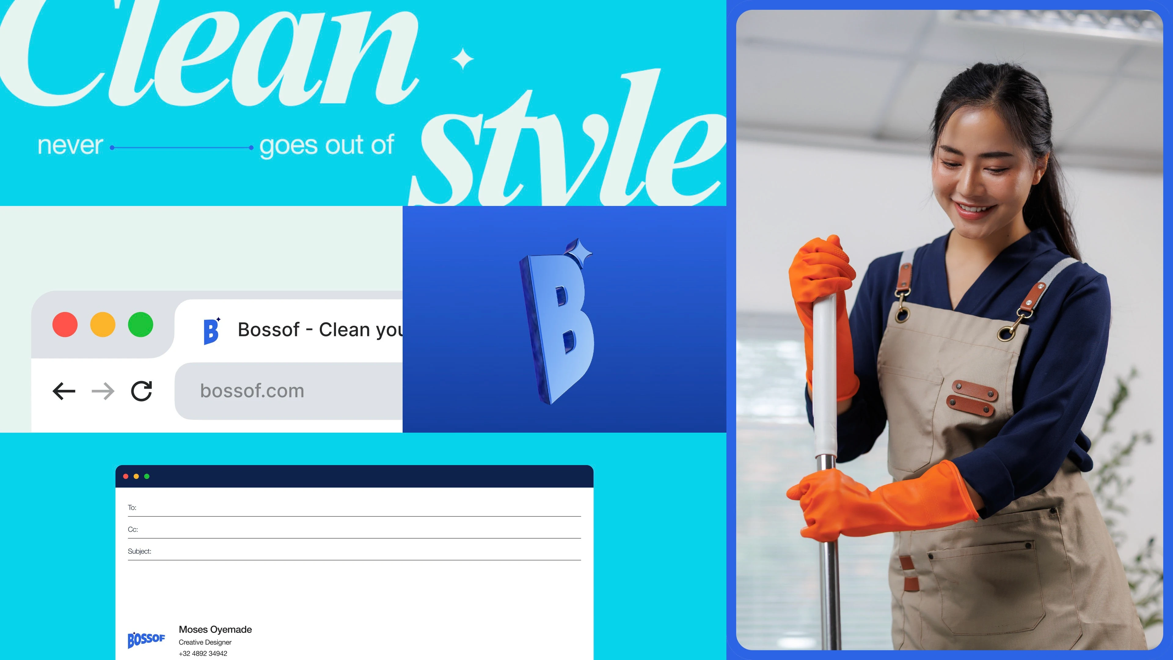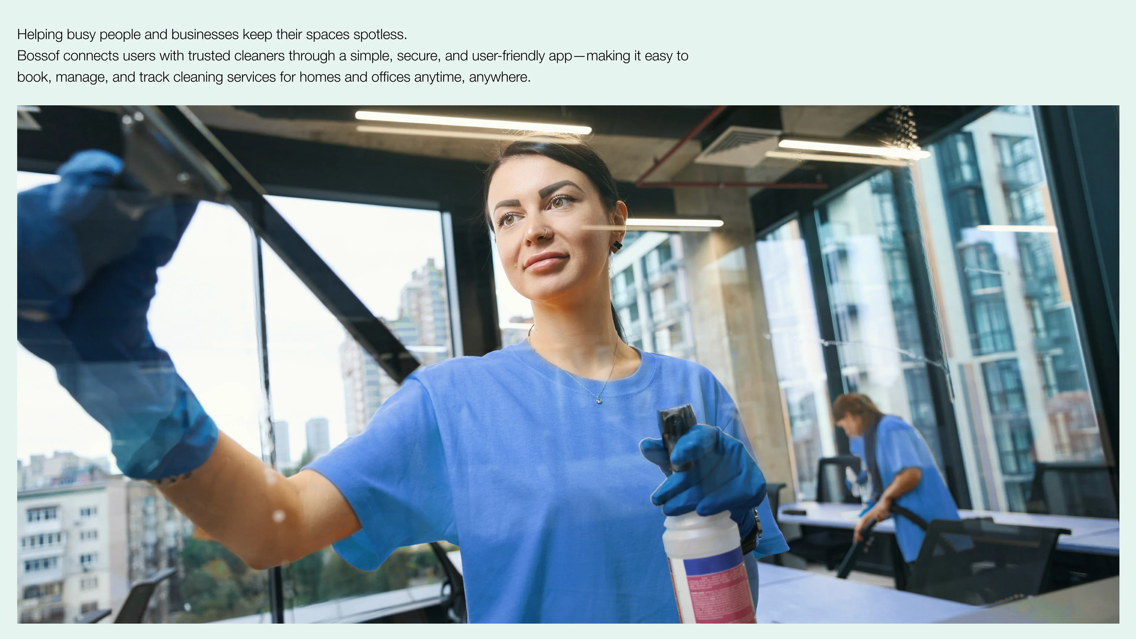 Brand, UX, motion design and Brand Strategy for Bossof an app for anyone who wants a cleaner home or office or Warehouse etc.