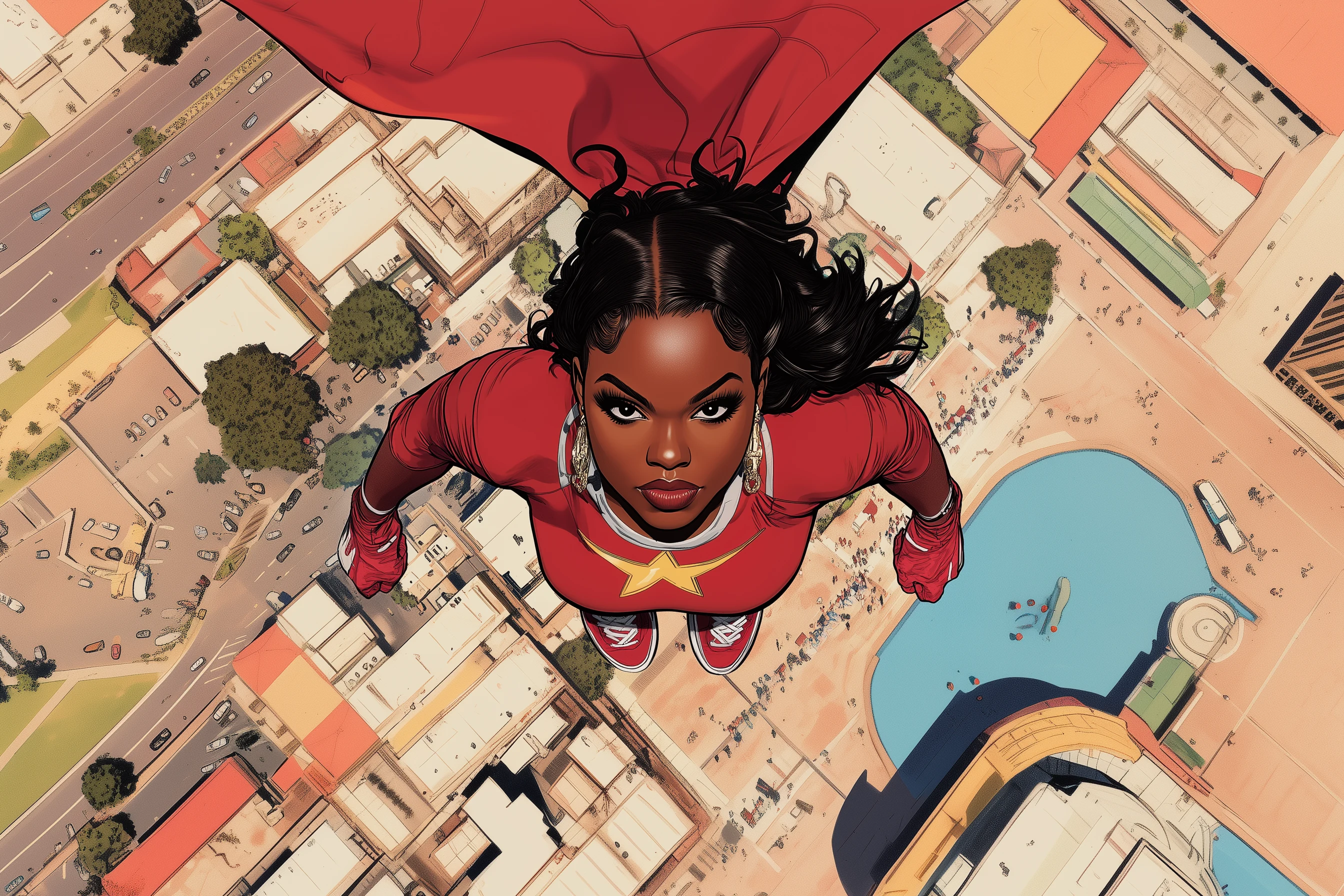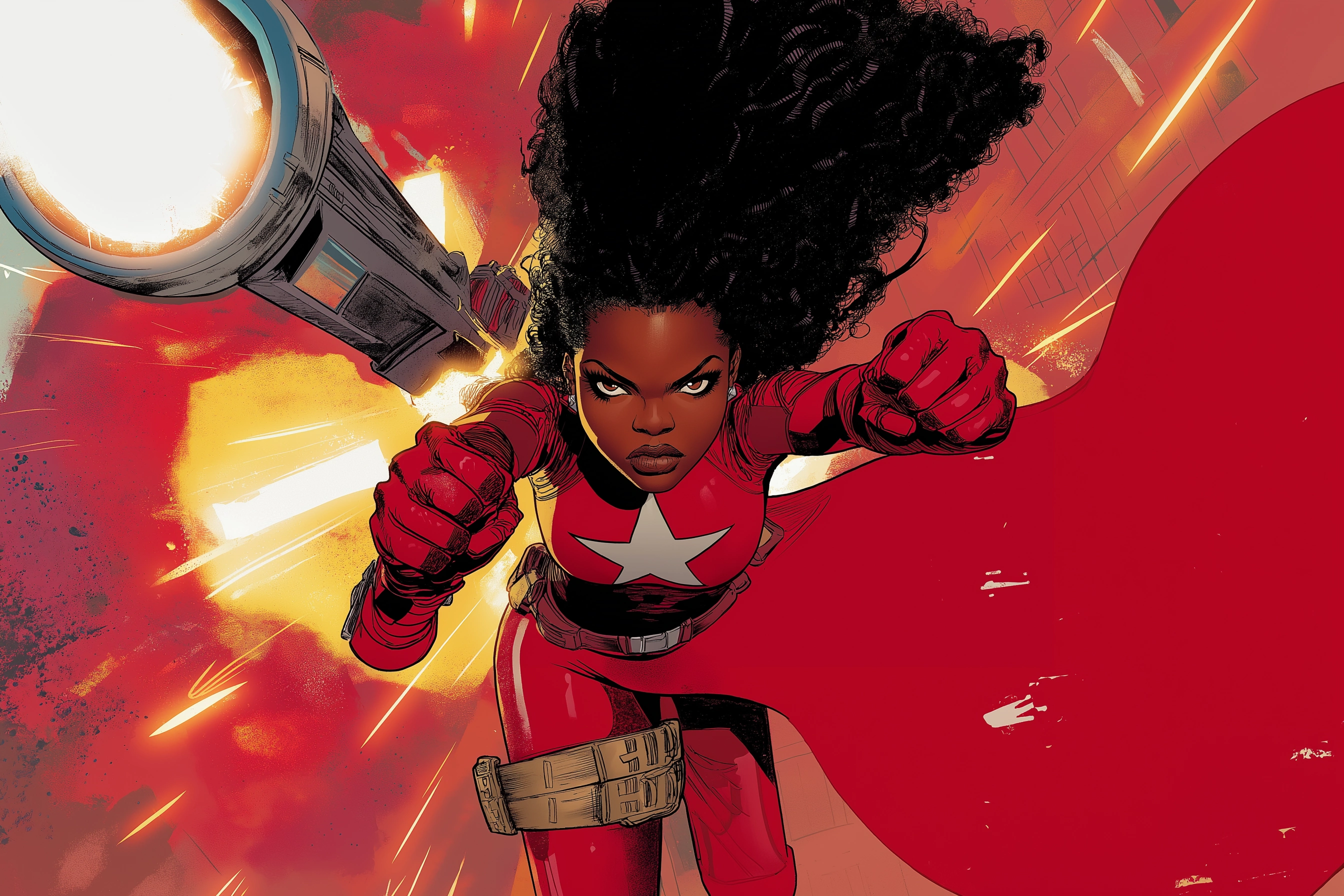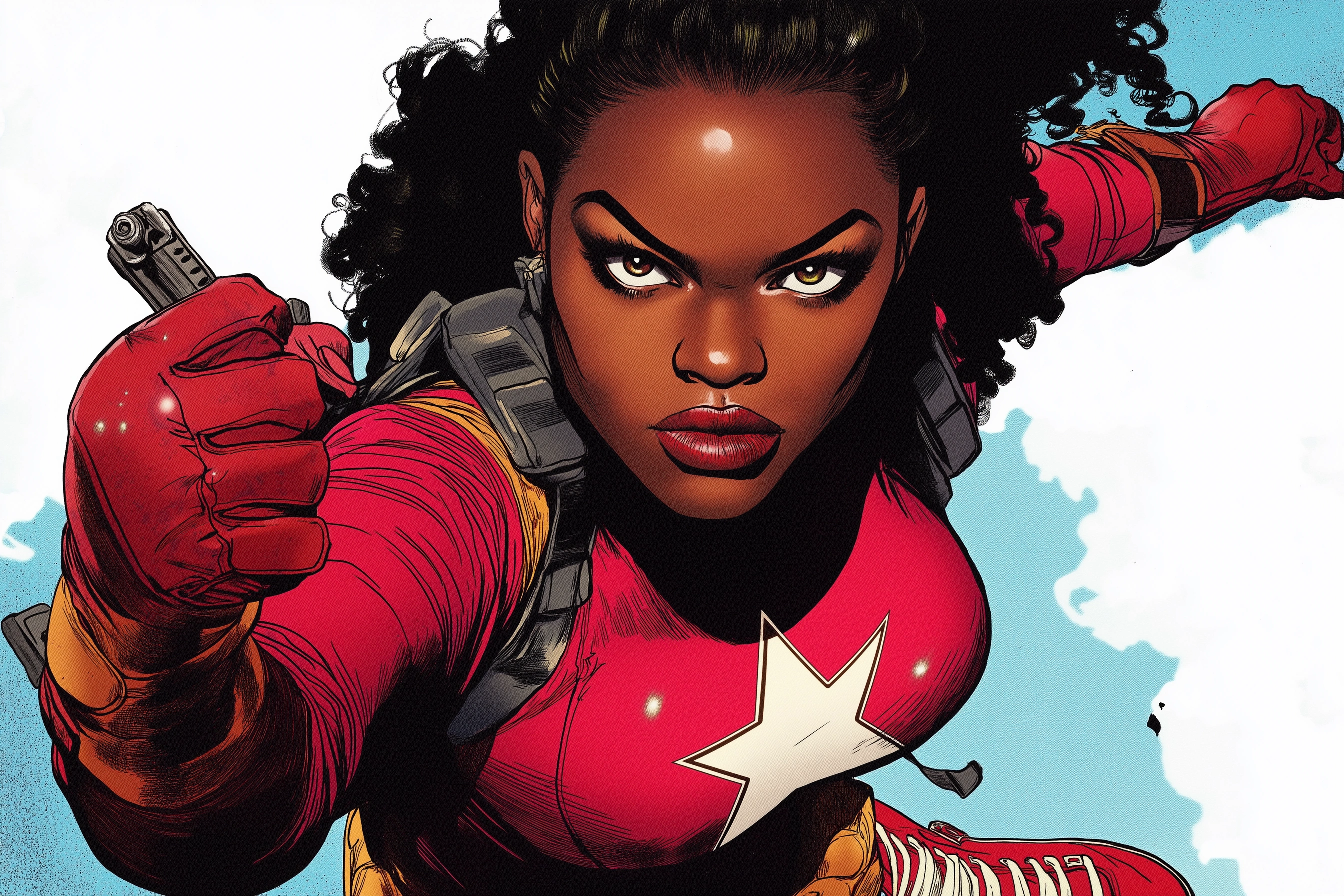 The comic aesthetic draws inspiration from graphic novels and superhero comics, with bold line work, dramatic shading, vibrant red-and-gold color palettes symbolizing power and urgency, and exaggerated poses that amplify Sutton's "badassery" while nodding to her character's martial prowess and leadership. This style not only heightens the film's themes of empowerment.