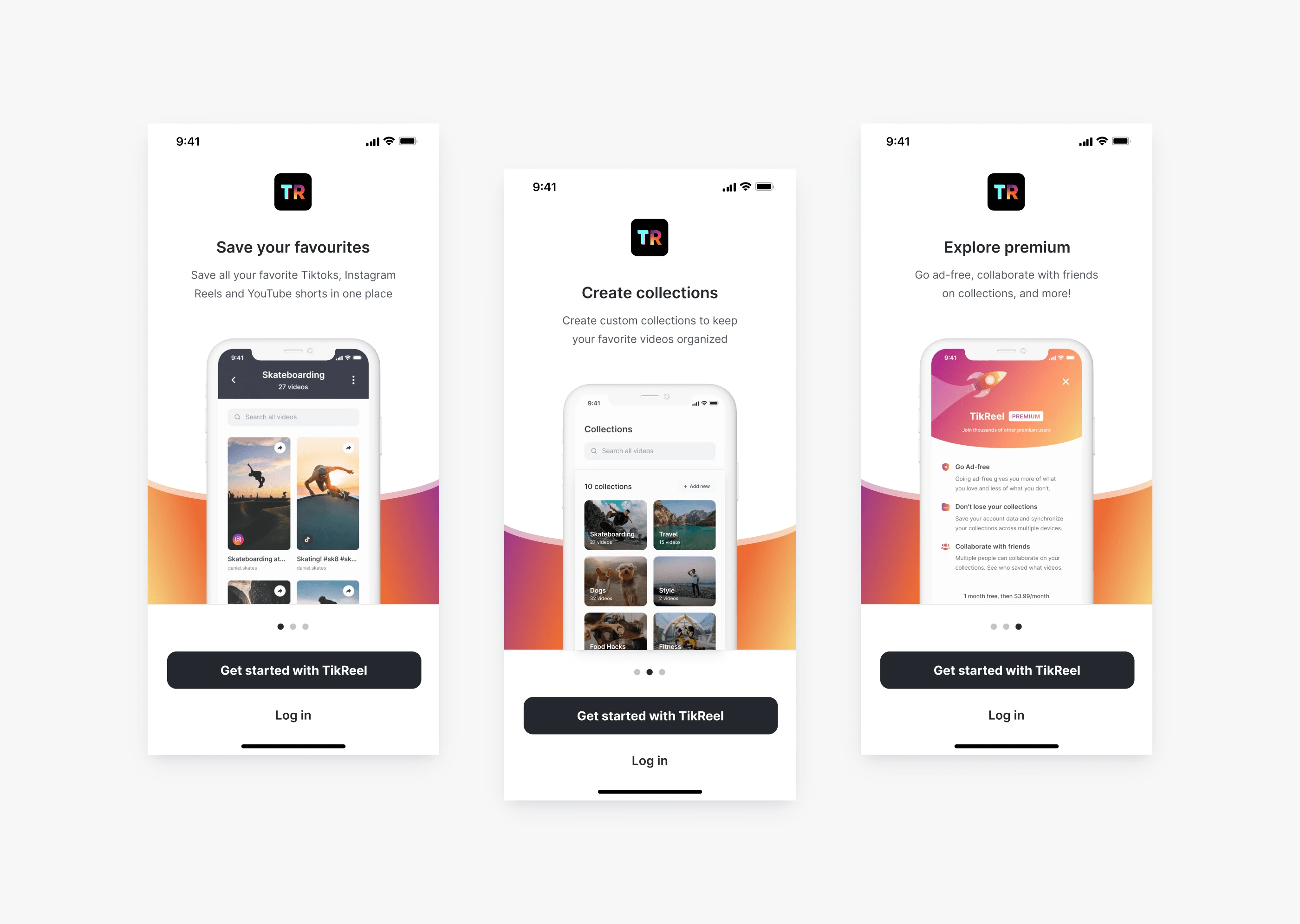 To achieve these goals, TikReel required a multitude of features and functionalities, including onboarding, collection creation, viewing and sharing collections, video saving, profile pages, settings, and an effortless upgrade process for users to access the premium subscription.