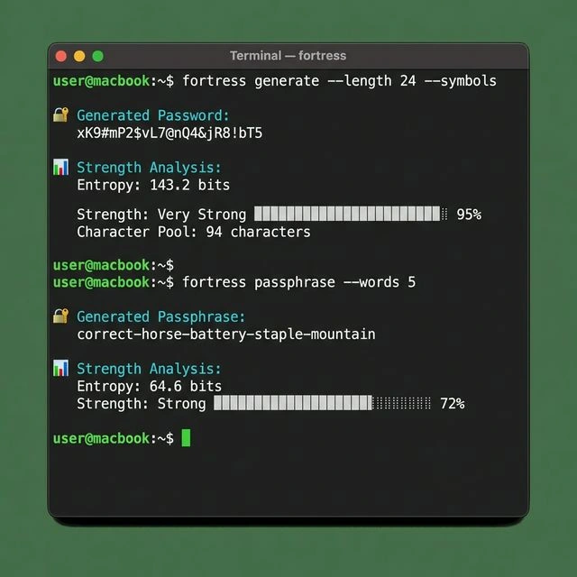 secrets module to generate passwords that are suitable for security-sensitive applications. It includes entropy calculation, strength estimation, and a beautiful CLI.