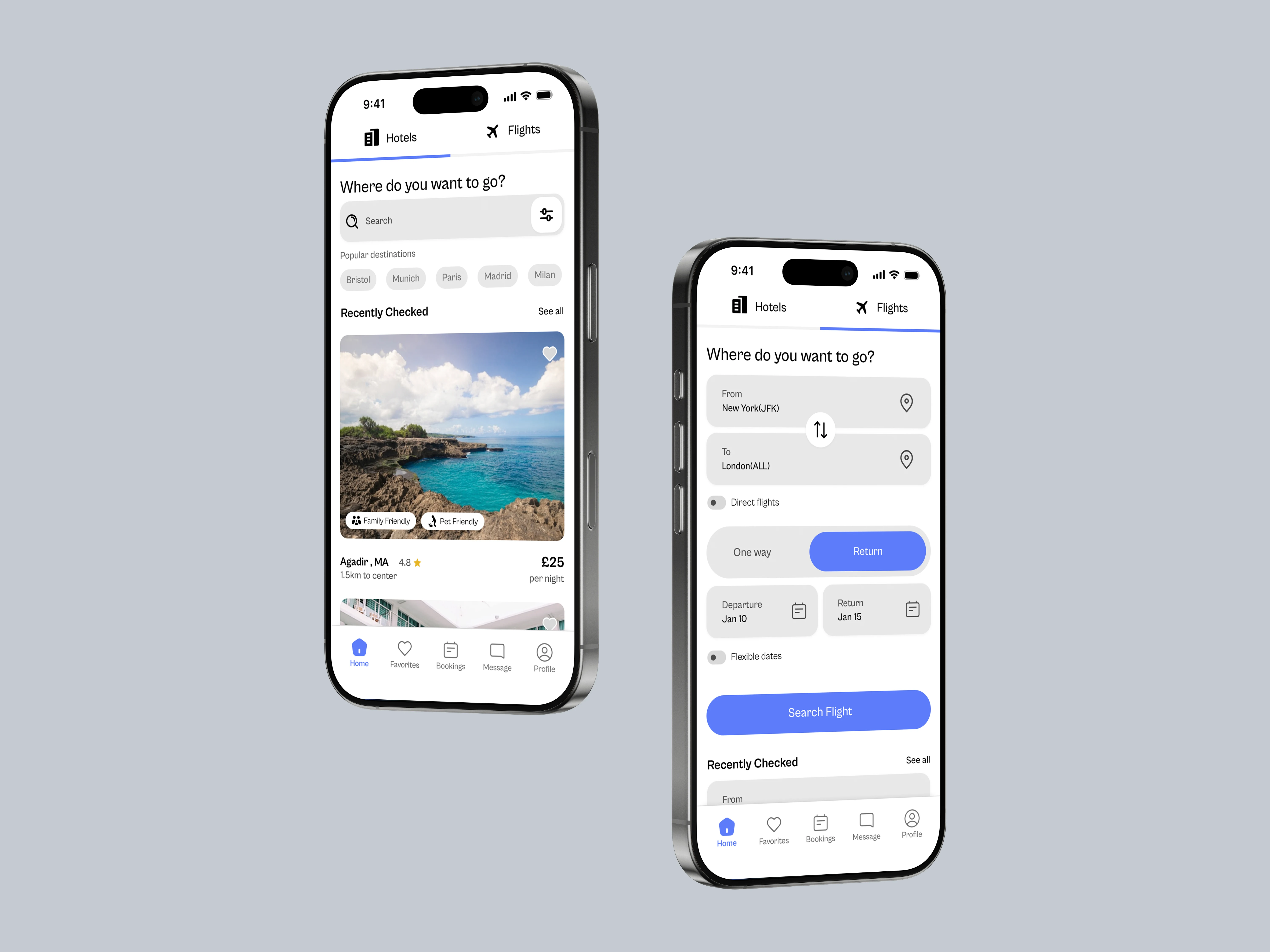 Modern travel app UI with hotel & flight search, flexible filters, sleek navigation, and clean design—built to make trip planning smooth and enjoyable.